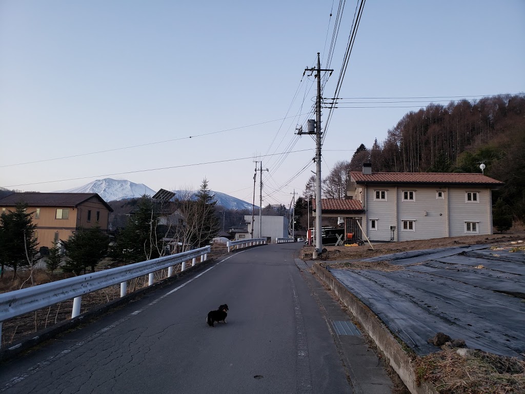 おはようございます。 野口 展孝です。 今日も北軽井沢エリアはいい天気となっております。 朝5時半に起きて薪ストーブに火を入れてワンコの散歩へ~。あさイチなのでリードつけないで元気に走り回っております! 自宅と浅間山とワンコのショット! だいぶ日の出が早くなってきました!