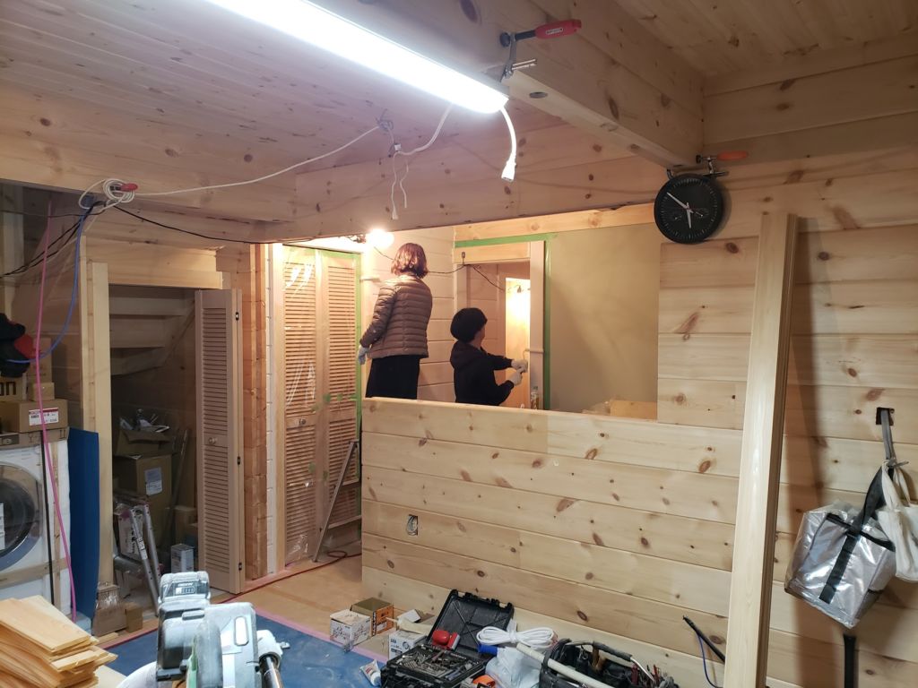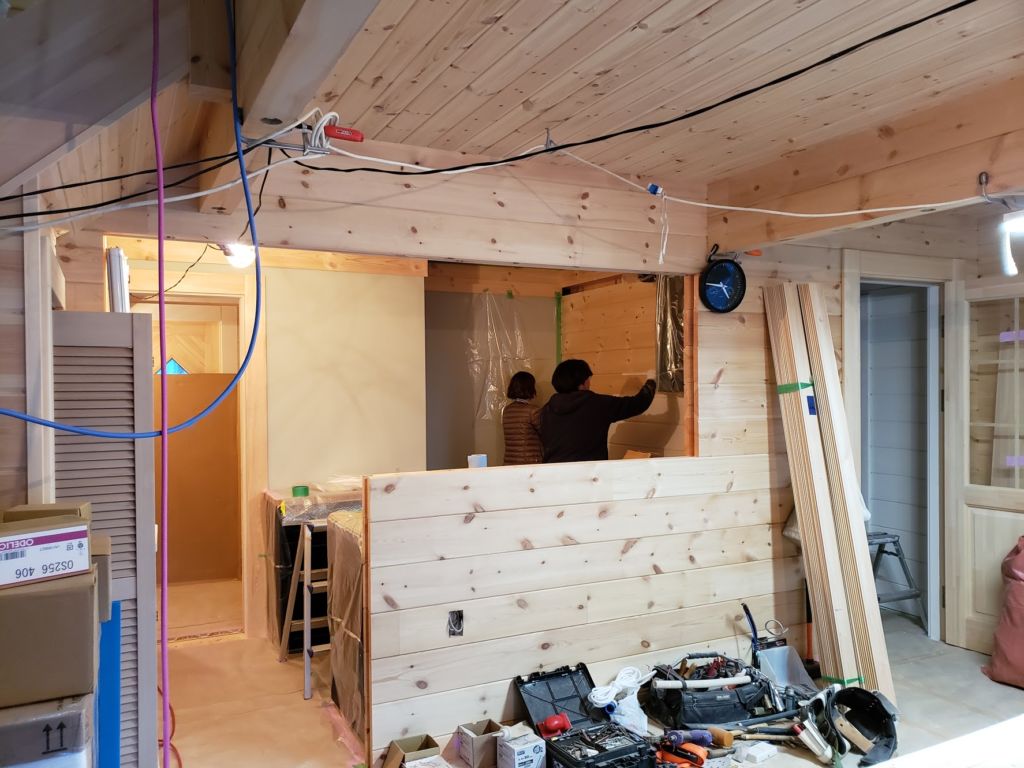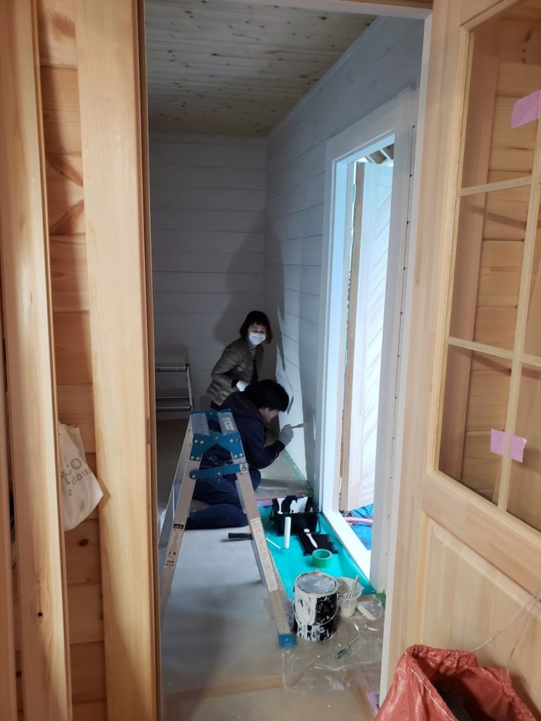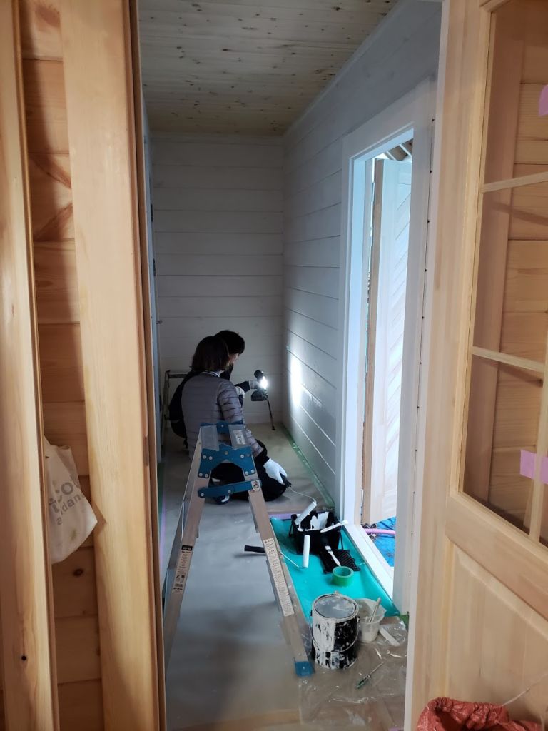 現場ではN様ご夫婦による室内セルフペイント! 仲良く協力して弊社ログハウスが素敵に仕上がってきていますよ! ザ・鎌倉スタイルのログハウス! いい雰囲気です。
