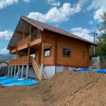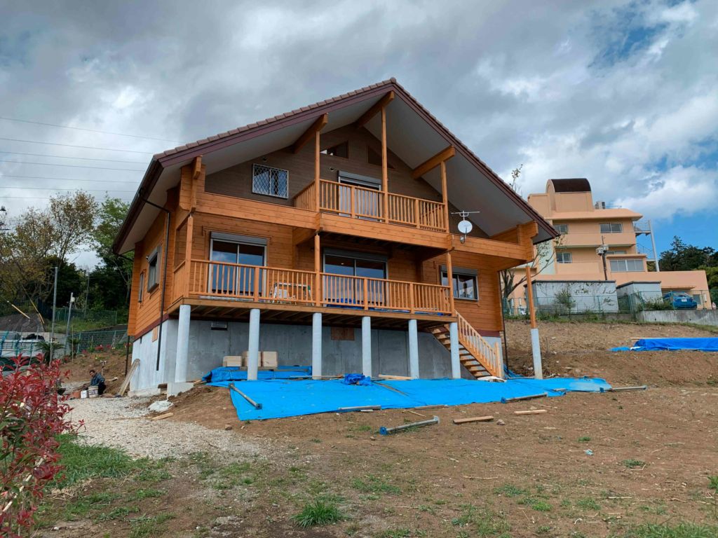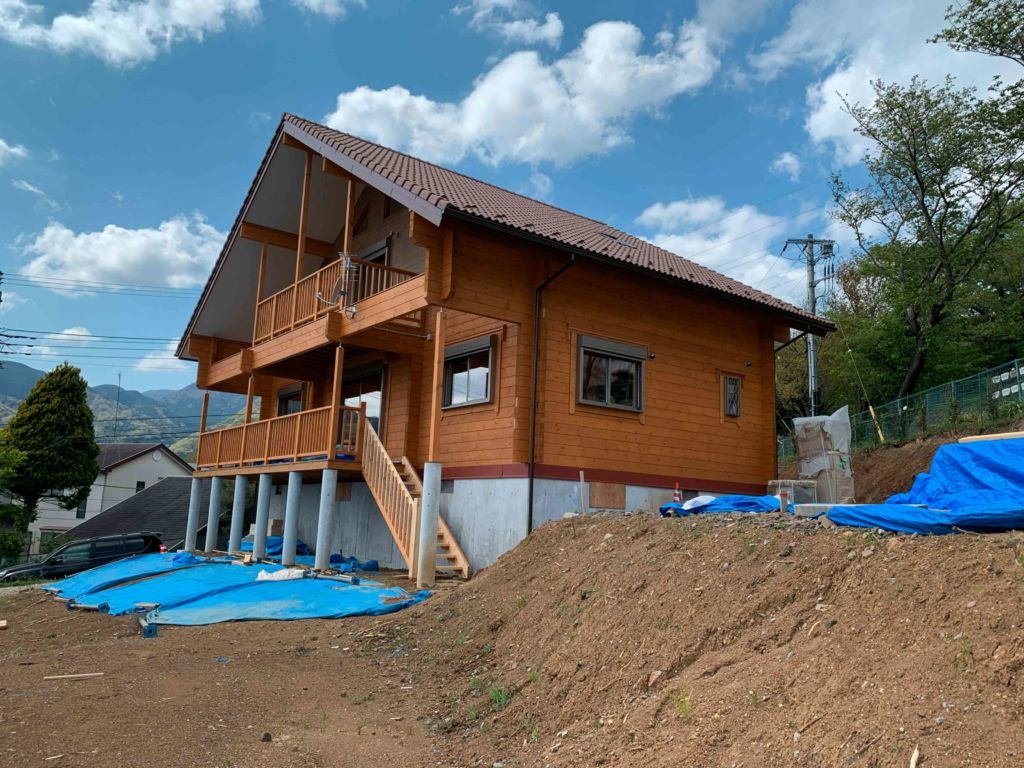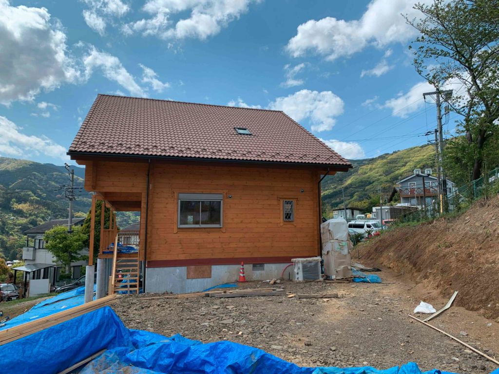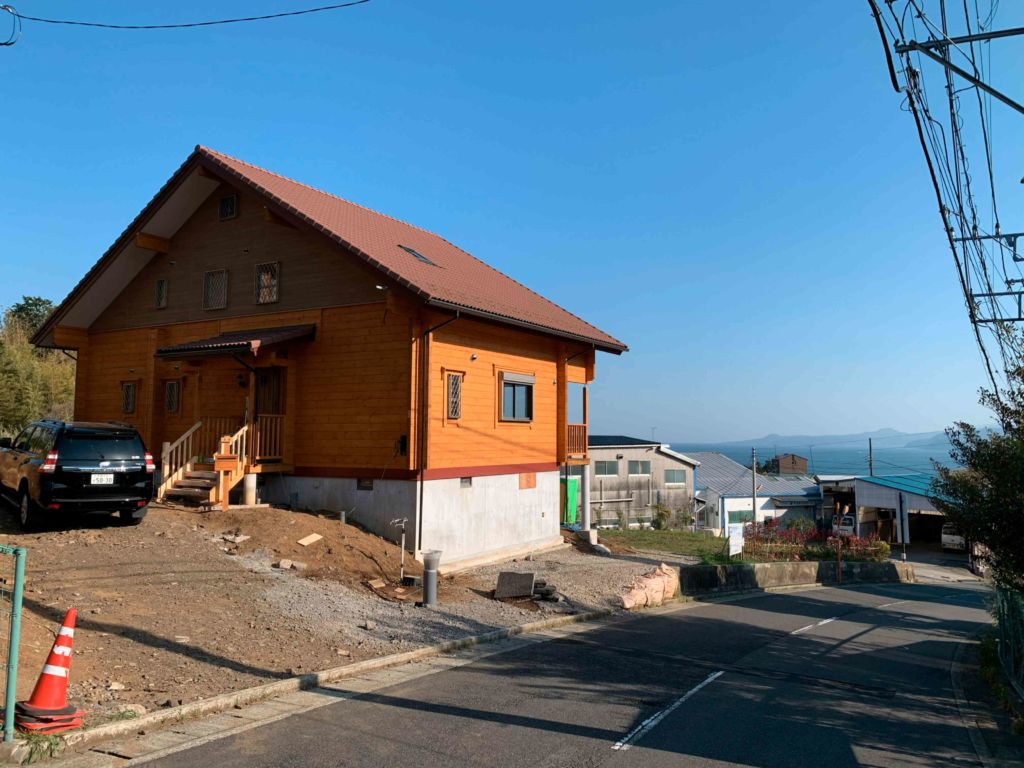 お仕事ですが湯河原町A様から昨夜メールにて足場解体された外観写真を送っていただきました。 足場が3か月ぶりに解体されましてログハウスの全貌がお見えになりましたよ!! いい感じですね~。 基礎も高いので迫力あります。 海が毎日見えるのも羨ましいです。