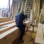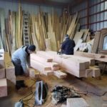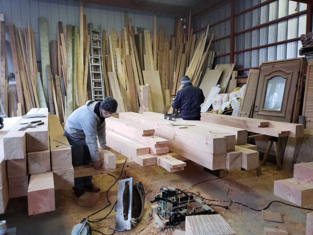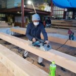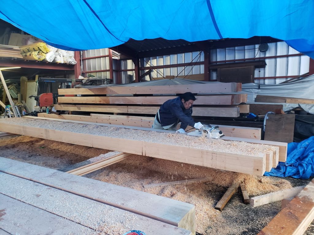倉庫では雨の中仮設屋根をつくって構造材加工工事進行中です!! 私もタクミ君に指導をうけて挑戦してみました。カンナ重いので大変です。