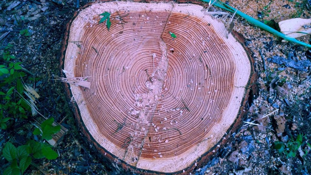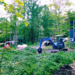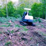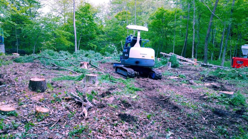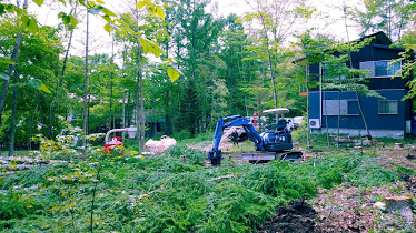 軽井沢K邸様ログハウス新築工事、伐採工事は昨日完了となりました。 切った細かい木はウッドチッパーに! 幹はK様の薪となるため現場にまとめておきました。
