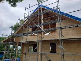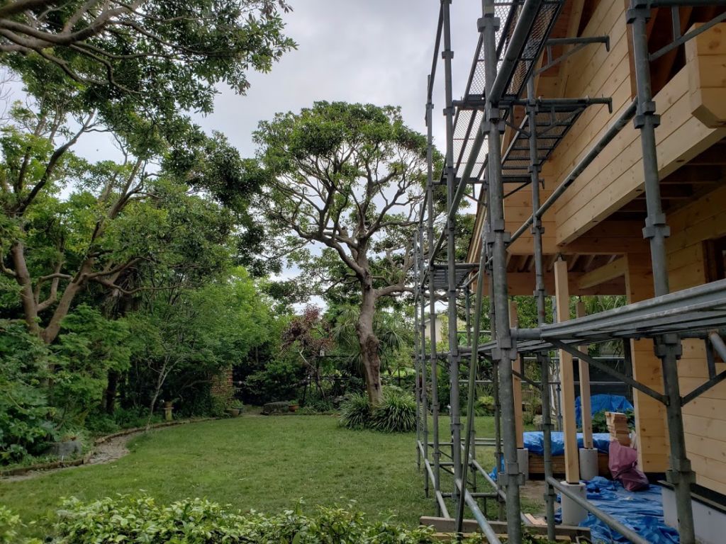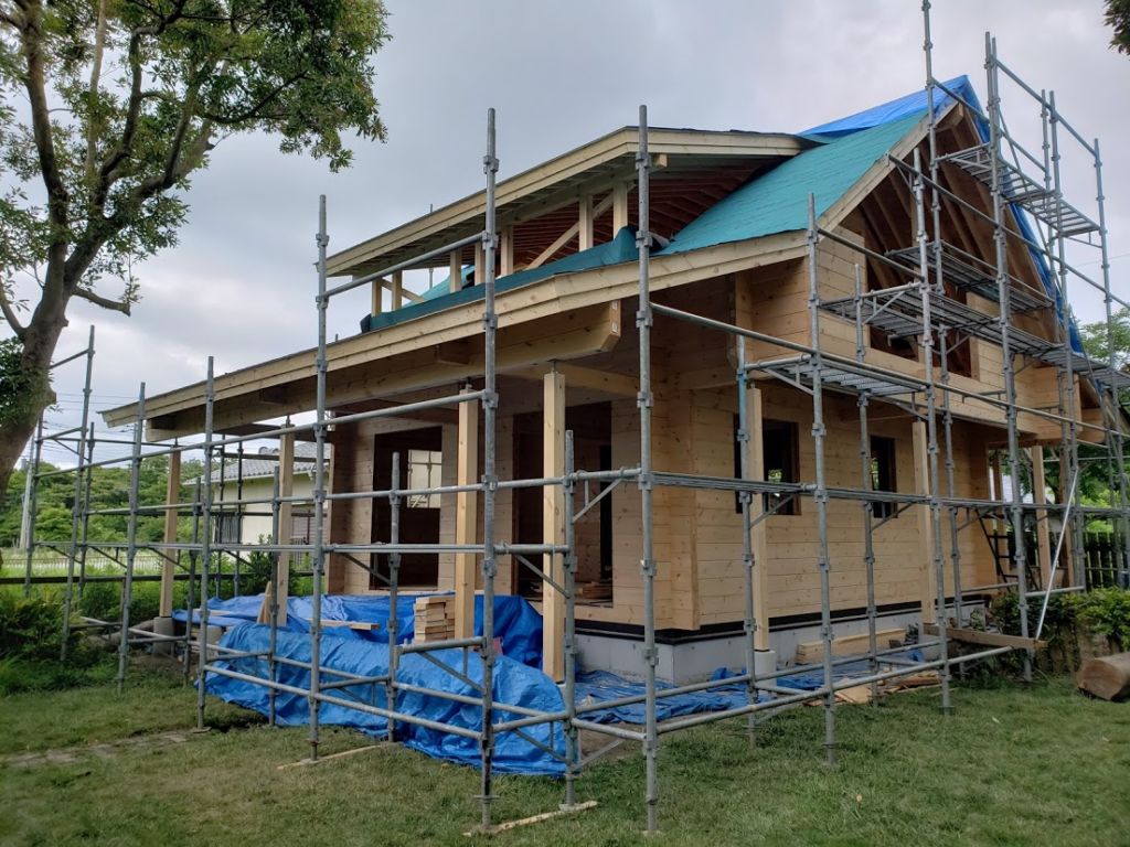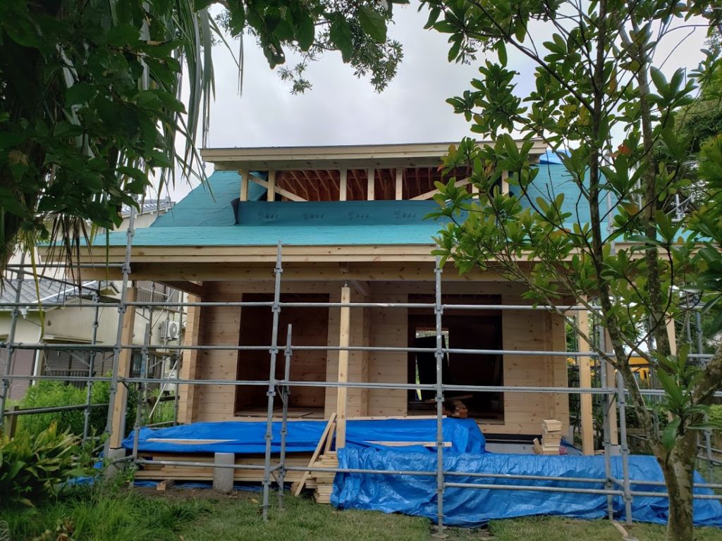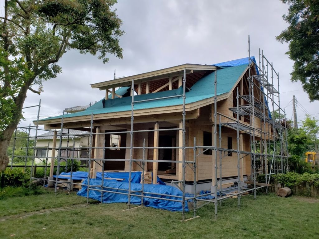 さてお仕事ですが千葉県長生村G邸様の建て方工事が無事完了して昨日夕方無事戻ってまいりました。 午前中に破風板、鼻隠し工事、葺けなかった一部ルーフィングを葺いて雨仕舞いは完璧です。 切妻の折れ屋根スタイルのログハウスは土地にマッチしていい雰囲気です。 G様はすでに手入れされ建物があった土地を購入、建物解体してログハウスを建築しております。 土地内には雰囲気の良い木や芝生、2件のミニログがあり土地内だけ見渡すと外国にいるような感覚をおぼえます。 いい場所でログハスウ建築お世話になれたこと本当に嬉しく思いますよ!!