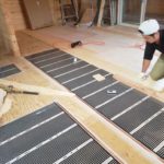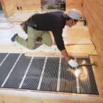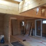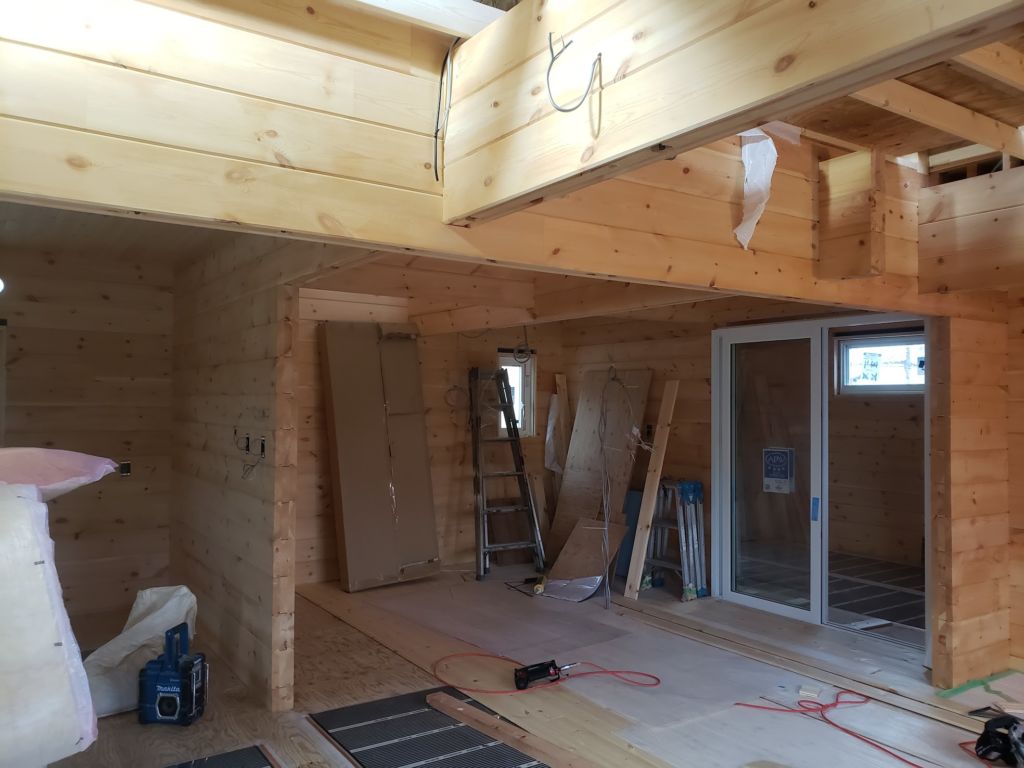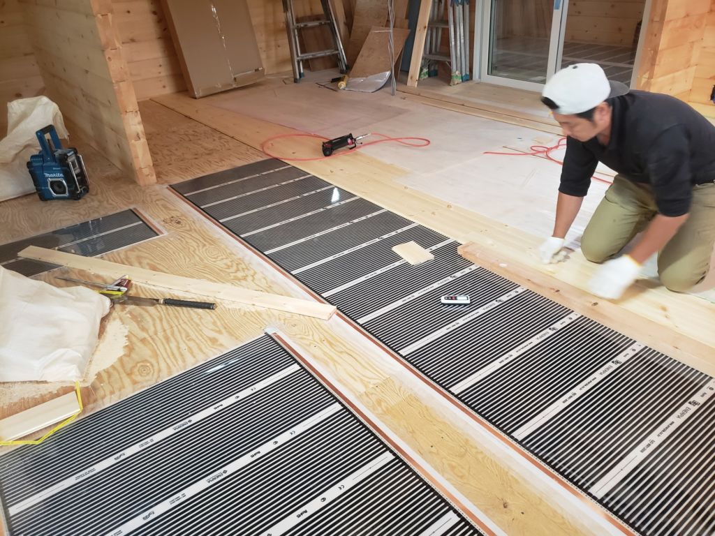 さてお仕事ですが軽井沢M邸様の造作工事をマサヤ君が頑張って進めてくれております。 日曜日にトップハウス滝田さんによる床暖工事が終わりましたので床板を施工しておりました。床暖房は電気式のフィルムシートになります! 15mmの無垢パインフローリングになりますよ。 軽井沢には自粛期間というものが7月25日から8月後半までございますので自粛期間前までになんとか形にできるようスタッフ一同頑張ります。