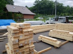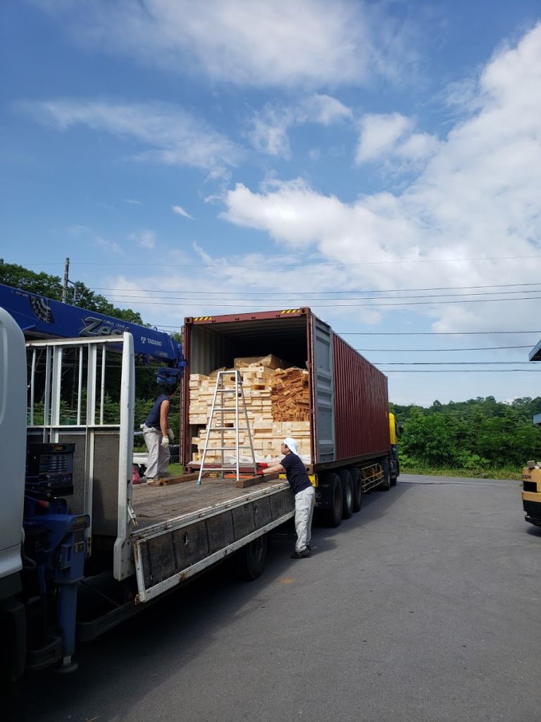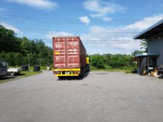 こんにちは野口展孝です。 今日の浅間高原は午後4時ぐらいから雨がパラパラ降りましたが比較的いい天気に恵まれました! 本日は軽井沢にて建築予定K邸様のログハウスキットを弊社倉庫にて荷下ろししました。 予定では先週軽井沢にて荷下ろしして軽井沢自粛期間前に屋根までと・・考えていたのですがここ最近天気が悪かったのと弊社が今抱えている仕事量を勘案して自粛期間明けに建て方工事を開始します!! 朝9時にログハウスキットが倉庫に到着!! 総2階建てログ+ログ厚115㎜なのでコンテナはほぼ満載でしたね。 これを1本1本マンパワーで下ろすのですから結構大変なんですよ(苦笑) 今日はそれほど暑くなかったですがかなりバテてしまいました。 職人さん、スタッフに感謝感謝です。