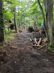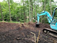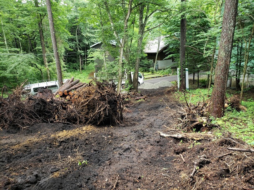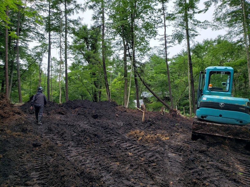 さてお仕事ですが軽井沢レイクニュータウンK邸様の造成工事にとりかかっております。 先月伐採工事をしまして軽井沢K邸様の基礎工事が完了したので安斉さんが造成工事に入りました。 大きなカラマツの伐根や20本近い伐根をして大分整地できてきましたよ。 難関は建物を建てる場所まで上がる道工事。 黒土という地盤状況やここ最近の長雨で地面が柔らかくなっており、大きめの石を補強して道をつけるご相談をK様とさせていただきました。明日土屋商店さんに浅間石の栗石運んでもらいます!