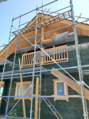 ログハウスのお仕事で千葉県長生村G邸様では完成にむけて工事進めておりますよ。 長雨のため外部塗装が遅れていましたが先週から急ピッチで塗装しています。 大工さんの造作は2階が終わり山崎さんが片付けと床ウレタン塗装の準備しています。