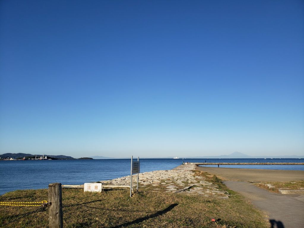 宿の目の前は海! 朝から天気よく富士山がよくみえていました!