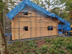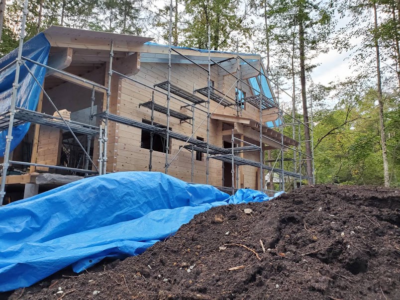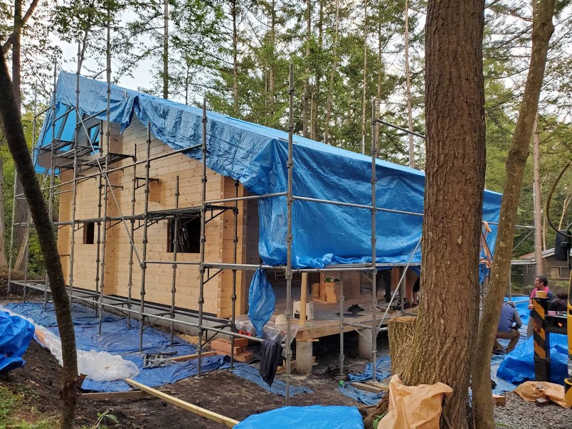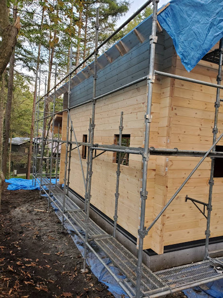 さてお仕事ですが軽井沢レイクニュータウン南平台別荘地にて今週から建て方工事始まっておりまして建て方4日目でログ組み完了して垂木がけ、一部野地板張りが完了しました。 私は工事に参加しておりませんが職人さんの頑張りで段取りよく進めてもらって感謝感謝ですね。 昨日足場も自社施工にて完了しました。
