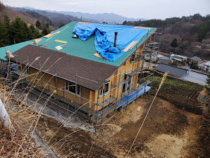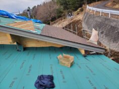地元嬬恋村ではM邸様のシベリアパインログハウスのアスファルトシングル屋根工事がの自社施工!山崎さんが段取りしてシングル葺き工事です。 こちらもいい雰囲気!! 葺きあがりが楽しみです!!