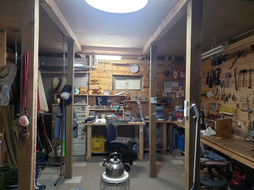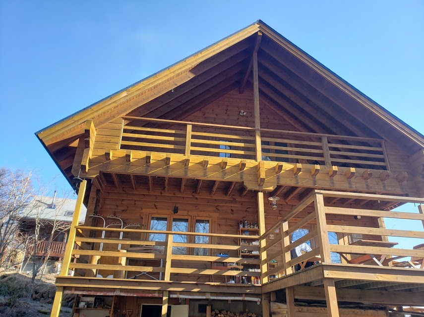 S邸様は私が入社して2年ぐらい経った頃建てたログハウスです。 土地の傾斜を利用した建物は基礎高2.7mなので基礎内は秘密基地DIYとなっております。 木工や溶接など本格的に作業できるスペースなんですよ。 当時の分譲地で一番最後に売れ残った土地が一番いい場所になっています。 土地の横には小川が流れて釣りでヤマメやマスが釣れるそうですよ。 塗り替えは一回ですが当時ステンプルーフのパインイエローで塗られた外観はいい雰囲気となっています。このぐらいの色合いが正直一番好きかもしれないですね。