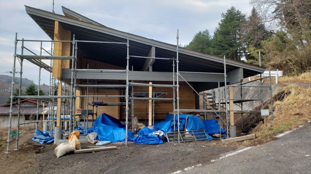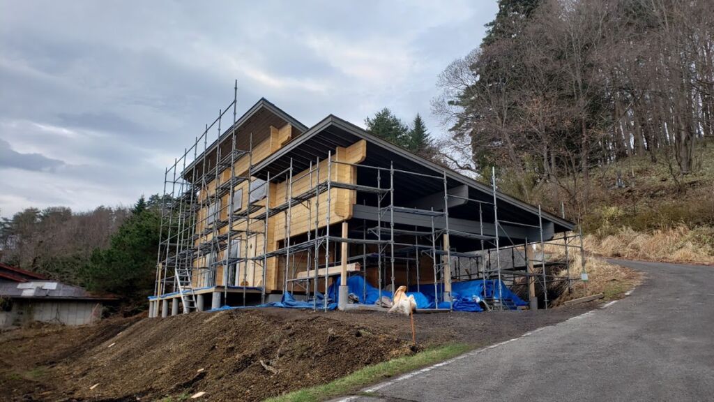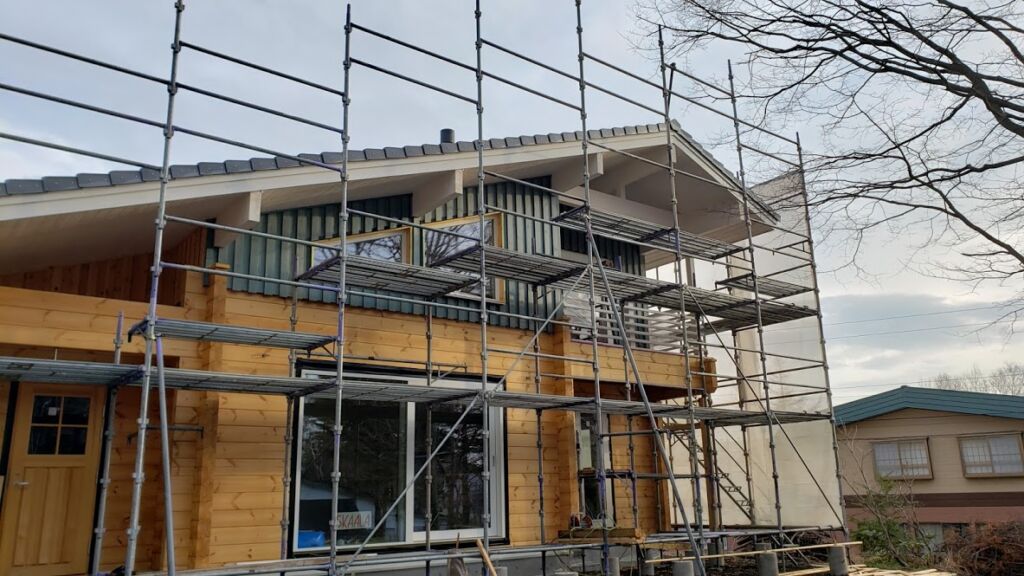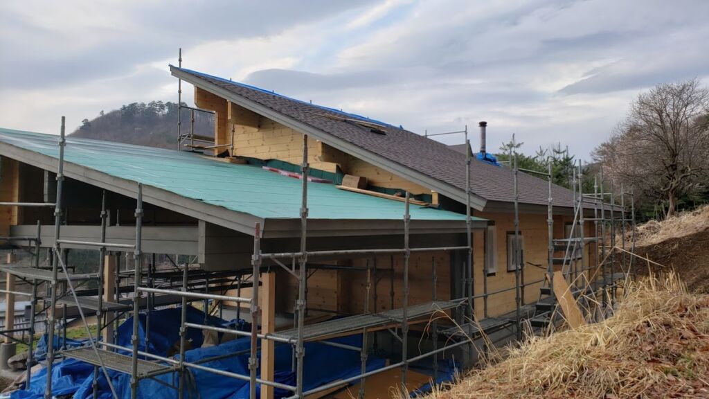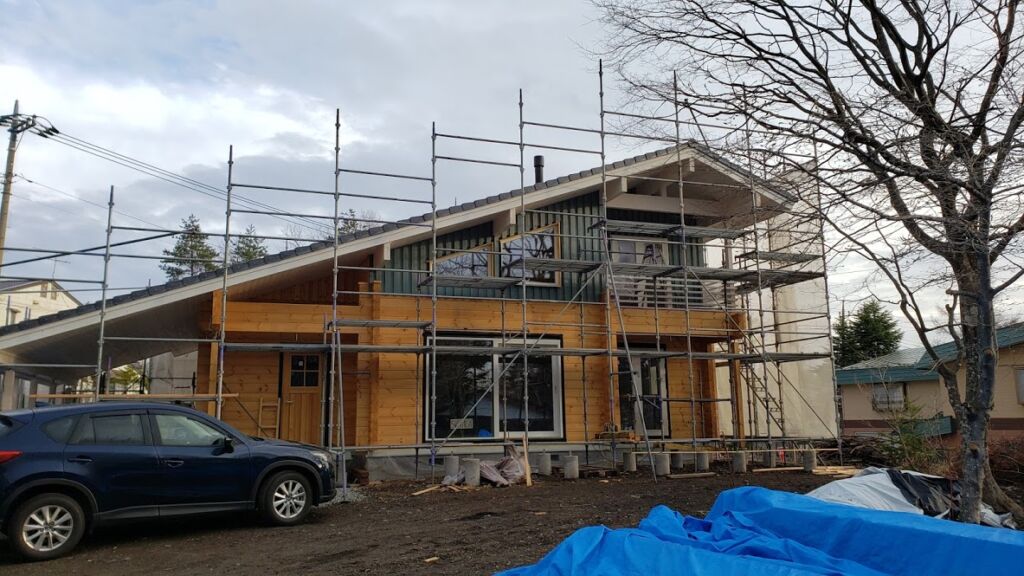 嬬恋村M邸様では屋根工事、塗装工事、造作工事、電気設備工事進めております。 高台に建つ片流れスタイルのガレージ付きログハウス。