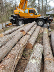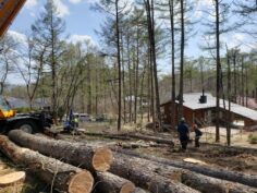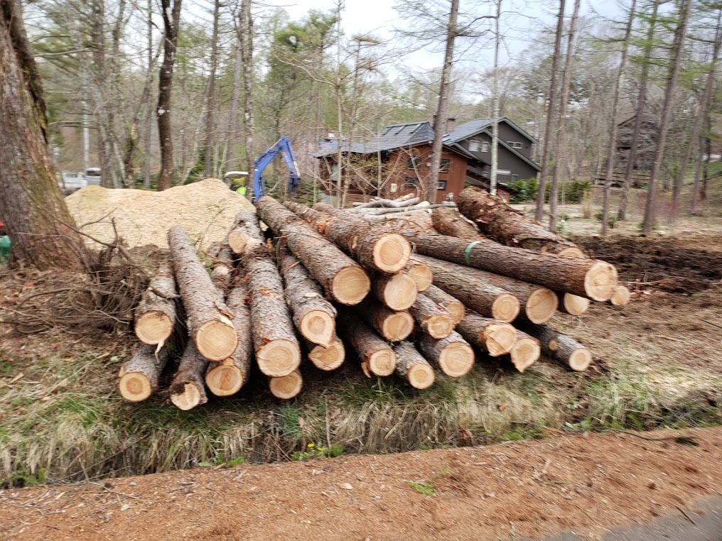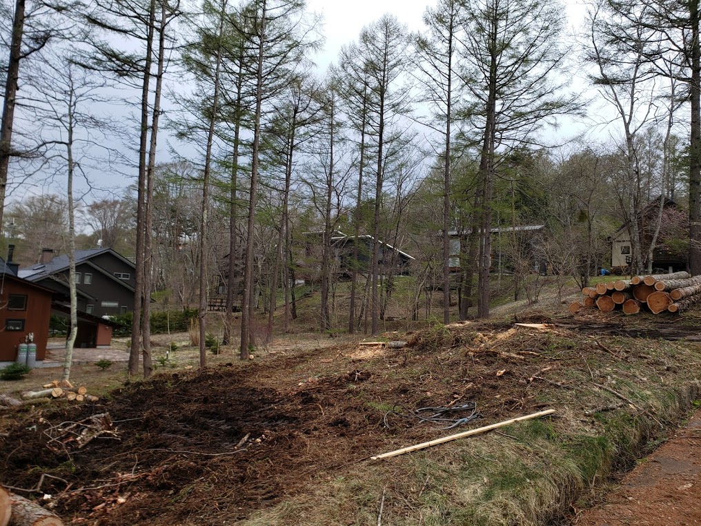 さてお仕事ですが、4月30日は軽井沢千ヶ滝西区にて伐採工事でした。 弊社にて建物建築をお世話になりますK邸様新築工事のための伐採工事となります。 一番大きな木で樹齢約50年のカラマツということもあって、いつもお願いしている清水興産さんにクレーン工事をお願いしました。 隣地には建物が倒木させることができないのでクレーンで吊りながらの伐採となります。