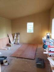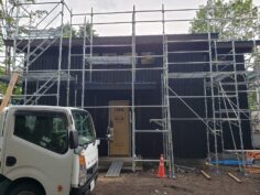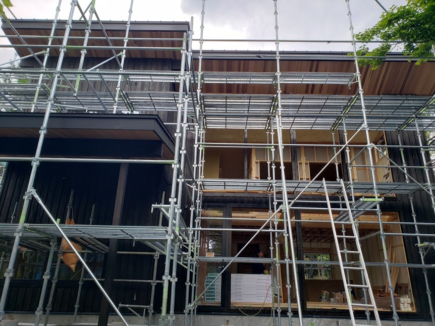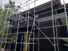 H邸様はログハウスではなく在来建築。 外部は杉板を張り塗装はエボニー色。 軽井沢スタイルのいい雰囲気の建物になりそうです。 ログハウスじゃなくても弊社は自信もって施工できますよ。