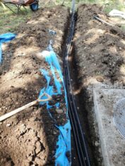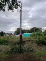 出張作業内容は昨日東京電力が電気引き込みにきましたので日曜日は弊社オリジナルの引き込みポールを建柱してきました。 建物に引込線やアンテナを取り付けたくないのでポールに地デジアンテナも取り付けさせていただきました。 ポールから建物の距離は7mありましたのでその間を埋設工事。 重機がないので人力手堀作業がかなりツライ作業でしたね~