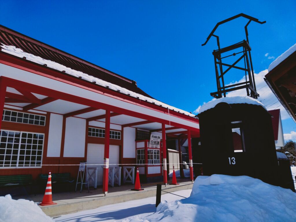 写真は管理会社すぐそばの北軽井沢駅の駅舎と電気機関車です。大正から昭和中期まで走っていた草津軽便鉄道(のちに草津電気鉄道)の一駅で、国の有形文化財とのこと。青空にばえます。