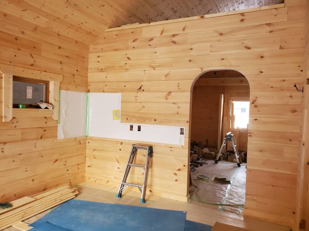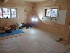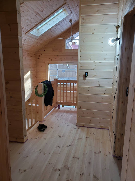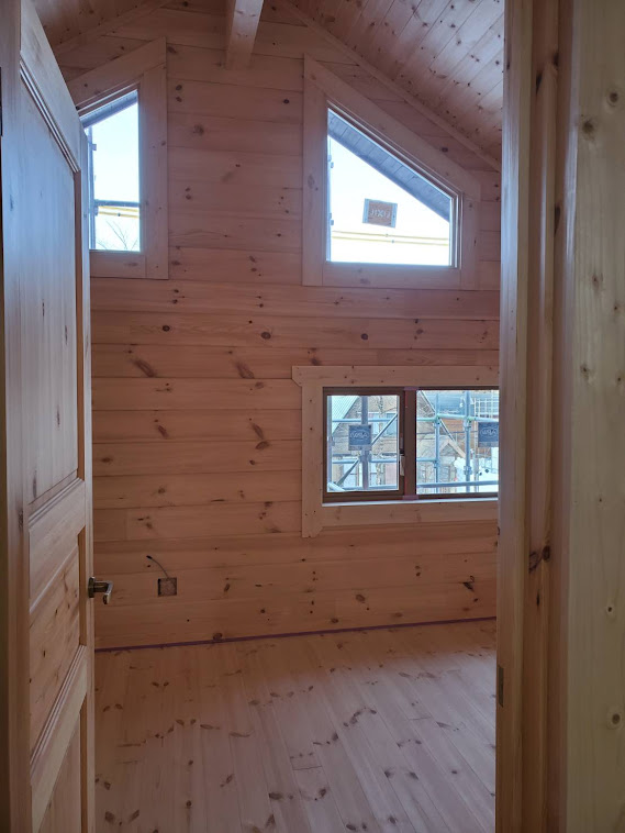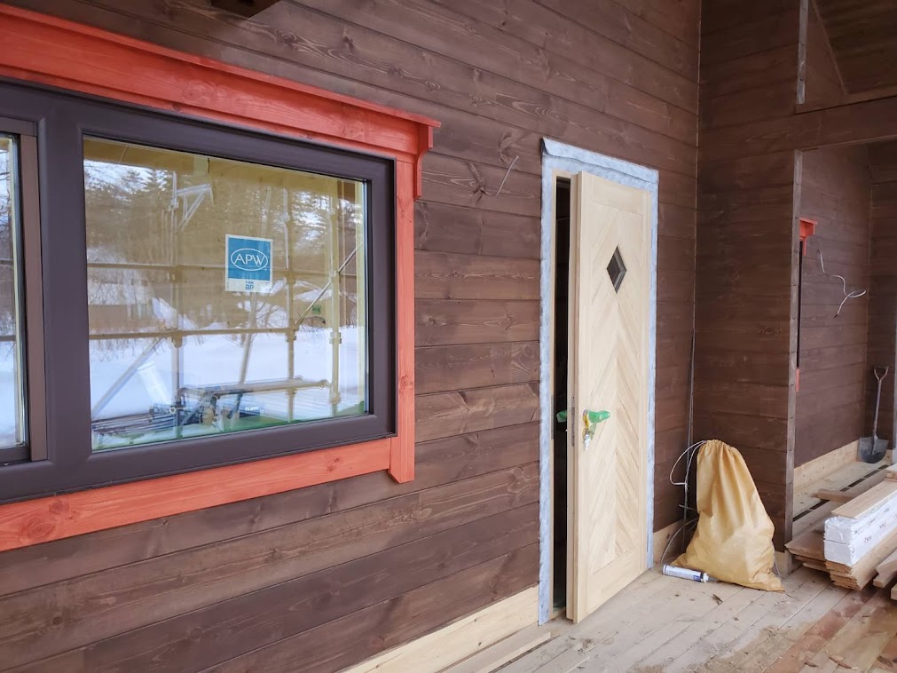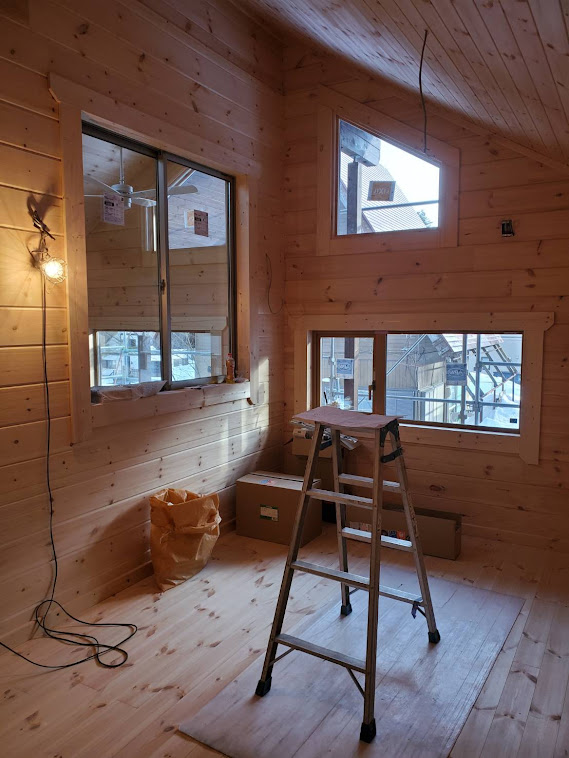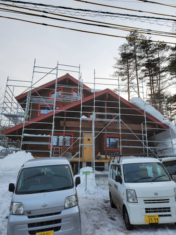 さてお仕事ですが長野県白馬村S邸様ログハウス新築工事は完成に向けて終盤になってきました。 足場は雪で埋もれてしまいまだ解体は先となってしまいますが塗装工事、屋根板金工事は完了。 大工造作工事も室内はほぼ終わり外部テラス貼り工事に入ります。 電気工事はスイッチ、コンセント、分電盤の取り付け工事進めておりますよ。 来週は内装屋さんが下見にきてクッションフロアの段取りとなります。