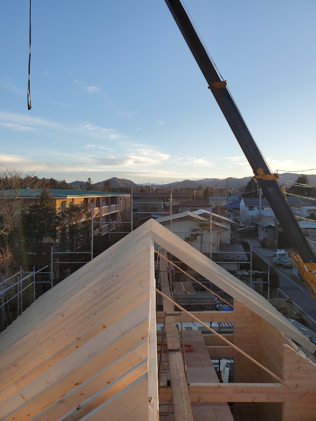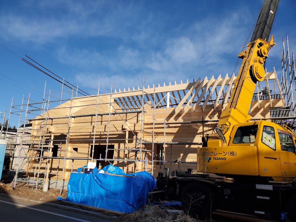 お仕事は昨日まで知り合いの工務店のお手伝いにいってまいりました。 ログ壁38段、15m×8mの大きなログハウスのログ積がようやく終わり垂木がけの作業に入りましたよ。 7寸勾配なので吹き抜けも部分は足場もしっかり組み安全対策もばっちりしましたよ。 屋根の上からはプリンスのスキー場などがみられます。 棟木の上からの景色はいつ見ても晴れやかな気分になります(私見ですけどね)。