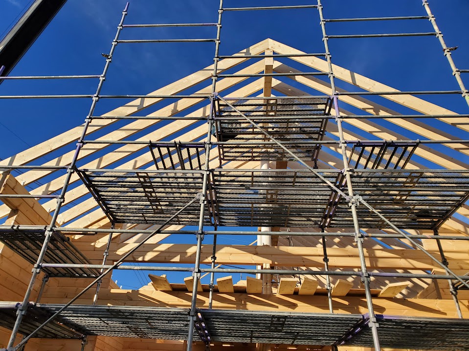 3. ログ積完了。 垂木掛け始めました!(工務店さんのお手伝い)