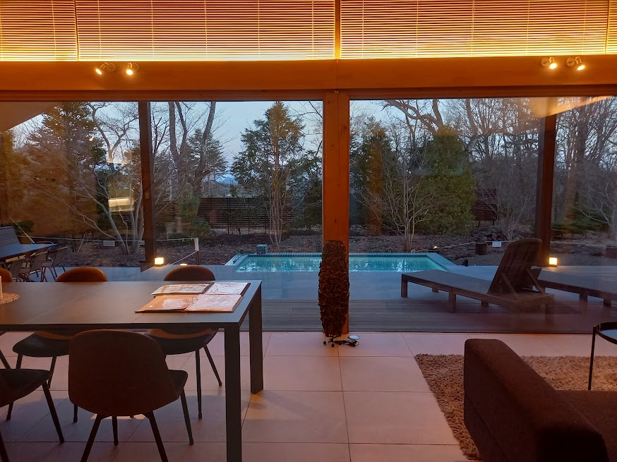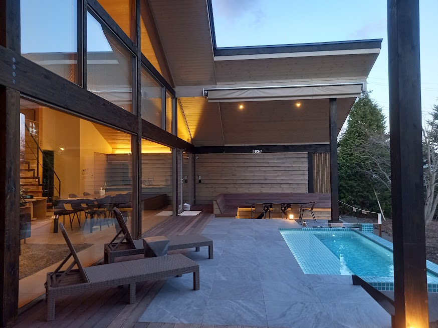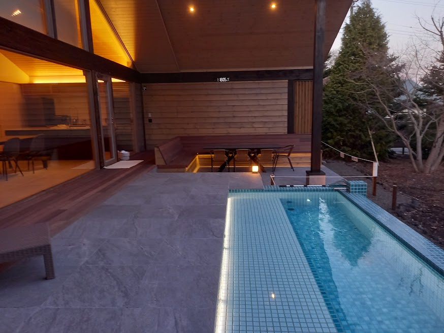 既存建物は大きな開放的なFIX窓がありそこから眺めるテラスにバーベキュースペース、ミニプール、ジャグジー、サウナといった施設を工事させていただく計画となっています。