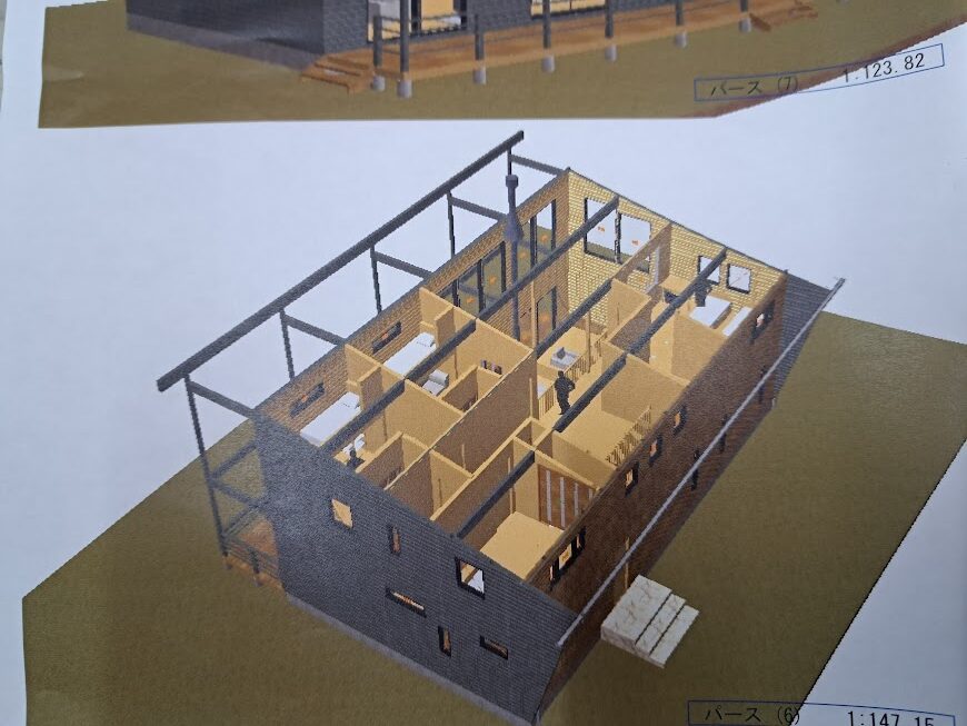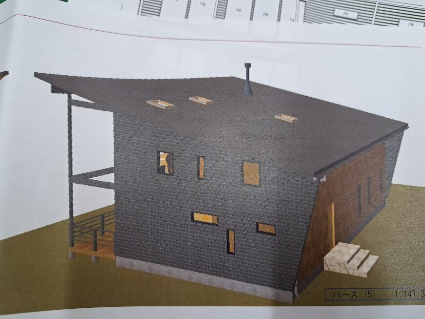 パースと立面図をちらっと紹介。 延べ床65坪の大きな建物です。 在来建築で建築します。