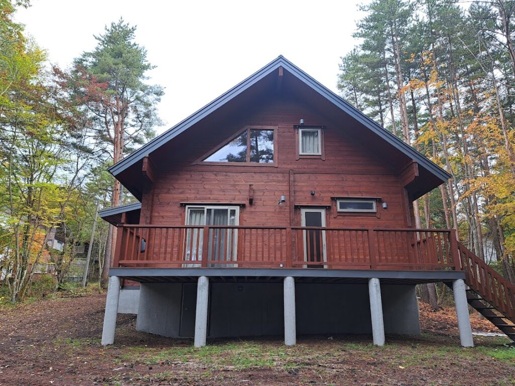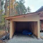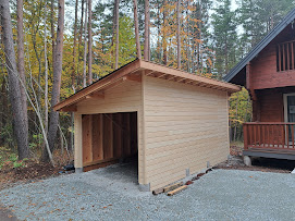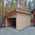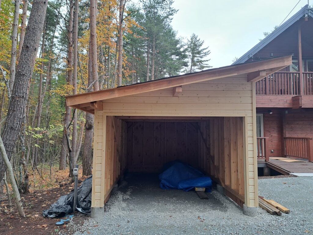 さてお仕事のほうですが浅間高原に今年5月に完成お引渡しさせていただきましたM邸様のお庭に車庫建築させていただいております。 大工さんが加工した車1台分のかわいい車庫が形になってきました。 外壁板をはったので大工さんのお仕事は完了。 あとは塗装と屋根板金、電気工事をして完了になります。