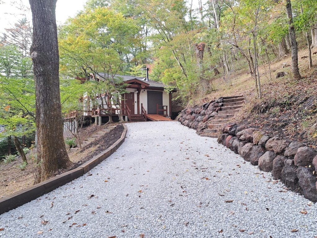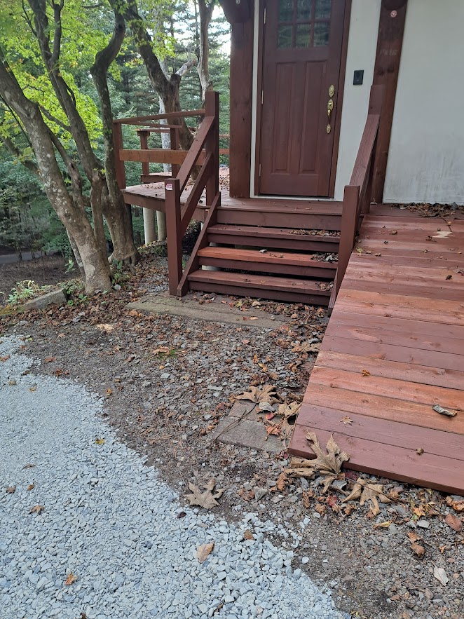 2016年に軽井沢にて建築させていただいたY様邸ではテラス手すり改修、玄関スロープ改修工事、外構工事を承り工事が終わりました。 新築当時のようなテラスに生まれ変わりました。入り口アプローチは法面に浅間石を積み上げて斜面のほうに枕木で土留めをしてアプローチも広くさせていただきましたよ。