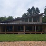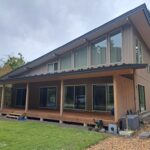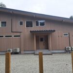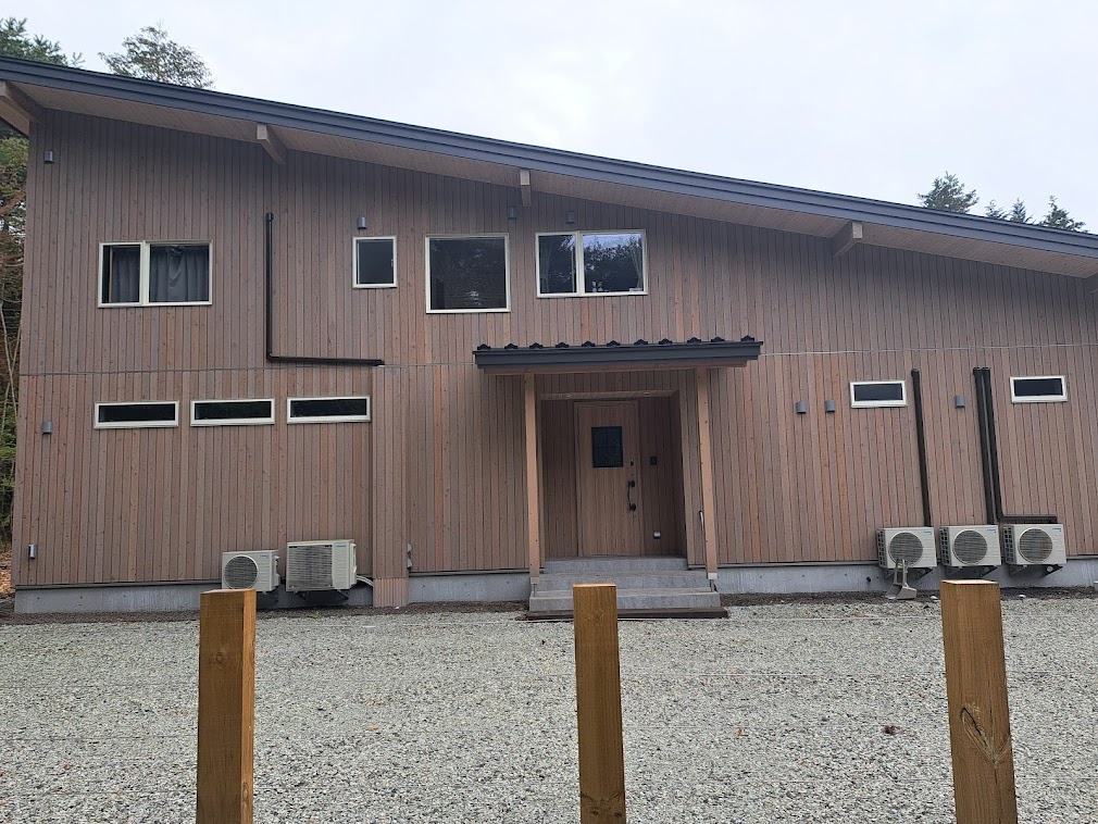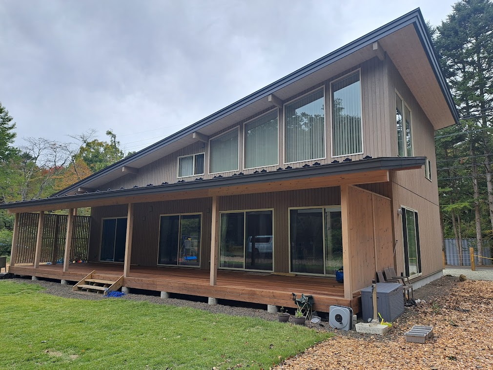今日は今年5月に完成お引渡しさせていただきましたK邸様の外観を紹介。 ログハウスではなく在来建築で建てさせていただきました。間口17mの片流れスタイル。 LDKが広くて解放感があるプランです。 外壁板はカラマツのサイディングで表面ざらざらしているので耐久性が高く雨にも強いですよ。