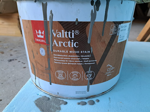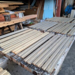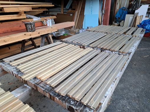 さてお仕事は只今ログハウスリンベーションをしております。私の考えでリノベーションしているので使う材料は弊社倉庫に眠っている在庫を使っております。 昨日は一昨年に工事した天井板の1mの余り材を腰板に使おうと思いティックリラの塗料で色付けしました。 他にも2坪ほどあまっている床材2種を張り分けてつかったり、10年倉庫にあった室内ドアをひっぱりだしてトイレドアに使います。 倉庫が片付いて一石二鳥。  「この余り材は使える」と思ってとっておいても何年も倉庫で眠らせるなんてことはしょっちゅうです。 できれば現場がおわったら全部処分することが一番なんですけど、貧乏性の性格なもんで仕方ないですね(苦笑)