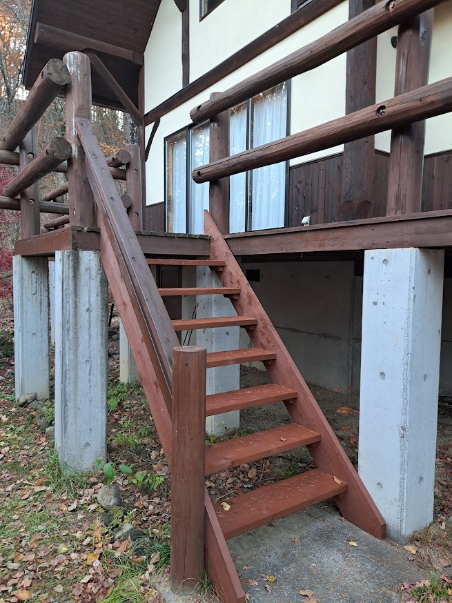 さてお仕事ですが、軽井沢千ヶ滝にて2007年に建築させていただきましたポスト&ビームのお宅、N様からのご依頼で外階段の改修とお庭フェンスの改修工事を取り掛かり始めました。 山中大工さんに依頼してお仕事です。 外階段の工事は完了。 フェンスと柱を解体して段取りしております。 フェンス柱は地中にそのまま埋めての作業になりますので冷えこんで地面が凍る前に工事すること必須ですね。 来週杭工事して倉庫にて塗装したフェンス板を取り付ける段取りになるでしょう。