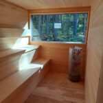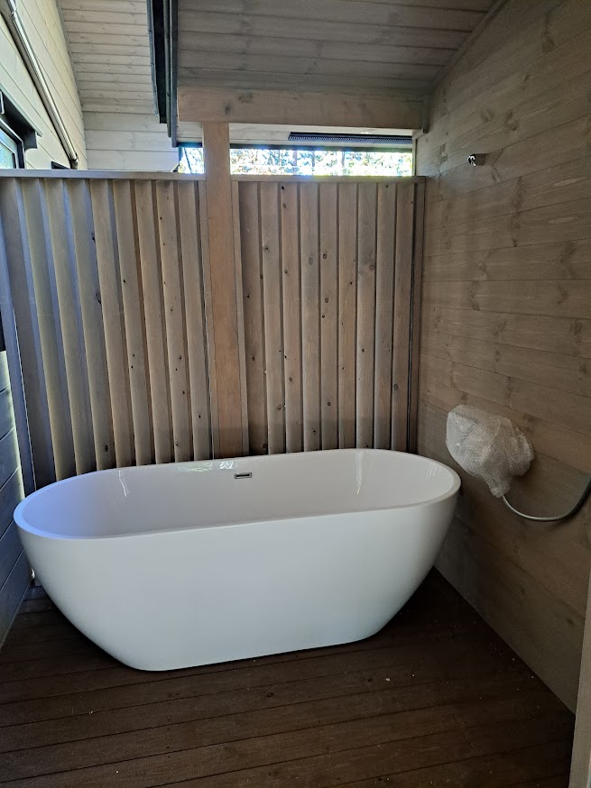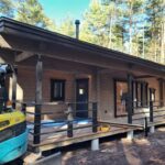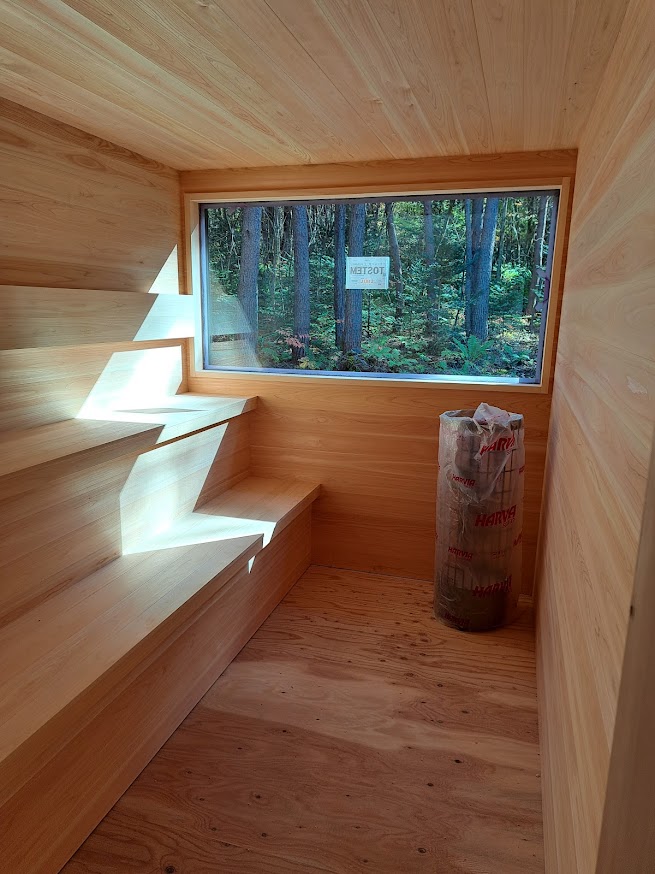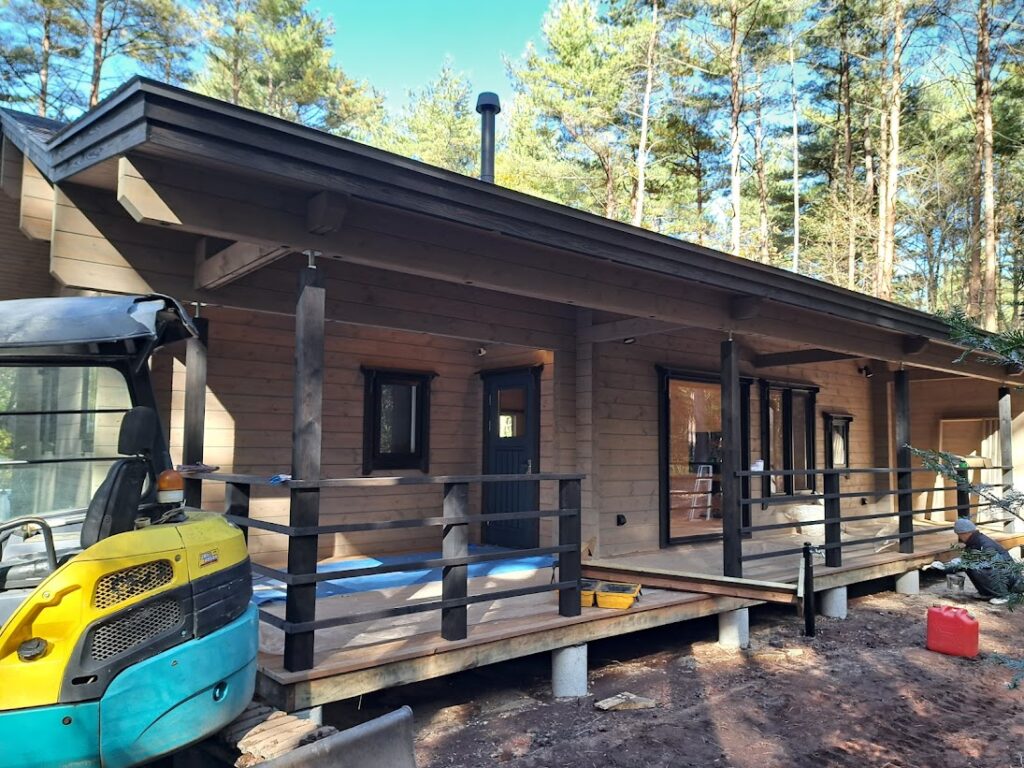 平屋のスタイリッシュなログハウス。 カラーリングもgoodですね! 私結構このカラーリング好きです。 サウナ工事も完了して水風呂設置もOK! サウナにはハルビアの9キロのサウナヒーターを設置予定です。