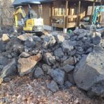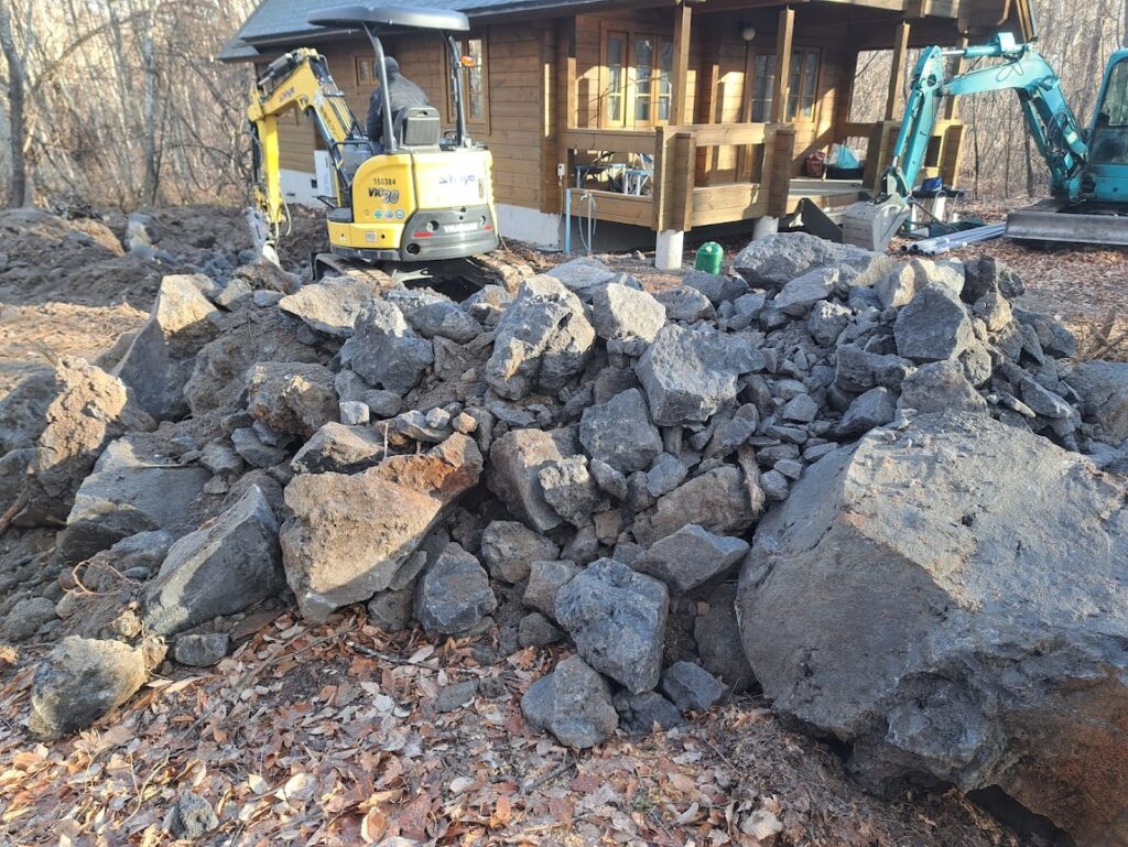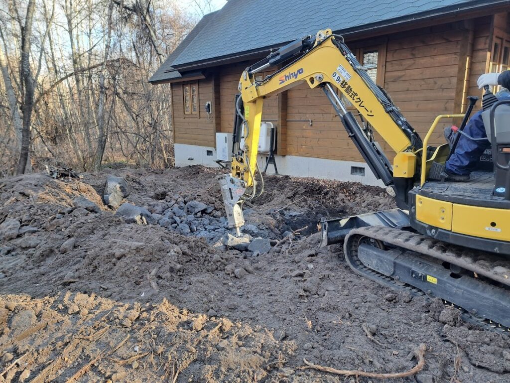 さてお仕事ですが弊社自社物件C棟の造成工事を進めております。 建物西側部分にテラスやミニプールを作る予定があるのですがその場所には大きな木2本と大きな岩が行く手を阻んでいました。 先月25tクレーンをつかって木の伐採は成功。 先週から滝沢さんに伐根と岩の撤去を依頼してましたが弊社のユンボでは歯がたたず、リース屋さんからブレーカーという重機を借りてきて伐根と岩の粉砕に取り掛かりました。 伐根は比較的簡単にいきましたが大きな浅間石がなんせ固くてこずりましたが工事に支障がない場所まで粉砕することができましたよ。