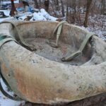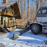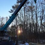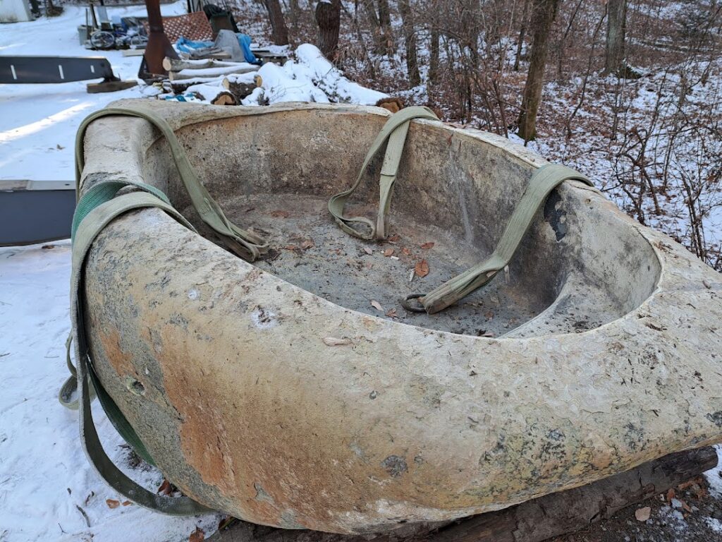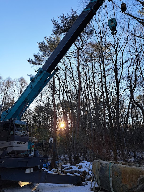 基礎工事は先週で完了したので火曜日設置となったわけです。 朝7時台に私のほうで太いスリングベルトを4本設置。 一本耐荷重2.5トンを4本なので7トンは耐えられると判断しました。 8時に25tクレーンにて吊り上げて8時半に大型ダンプを手配して積み込み。 2キロ先の設置場所に移動して9時半には無事設置場所に据え置きました。 石風呂には排水穴がありまして排水が流れるように高さを微調整しました。 一度OKしてクレーンをたたむころ少し問題があり再度微調整。 クレーンがなければ絶対浮かせることできないですから修正できて安心しました。
