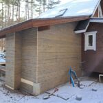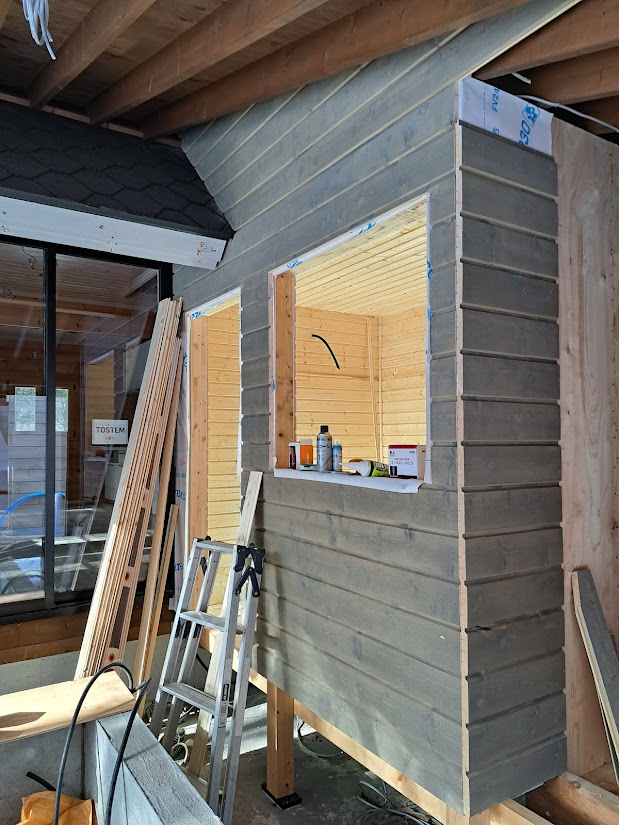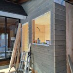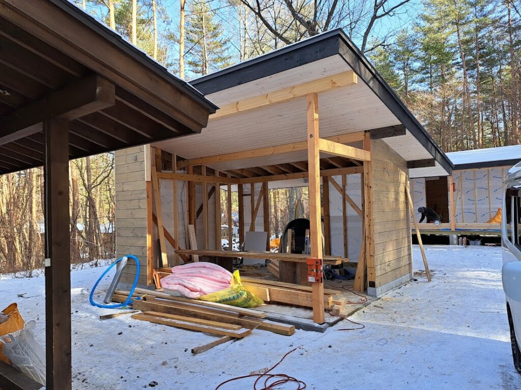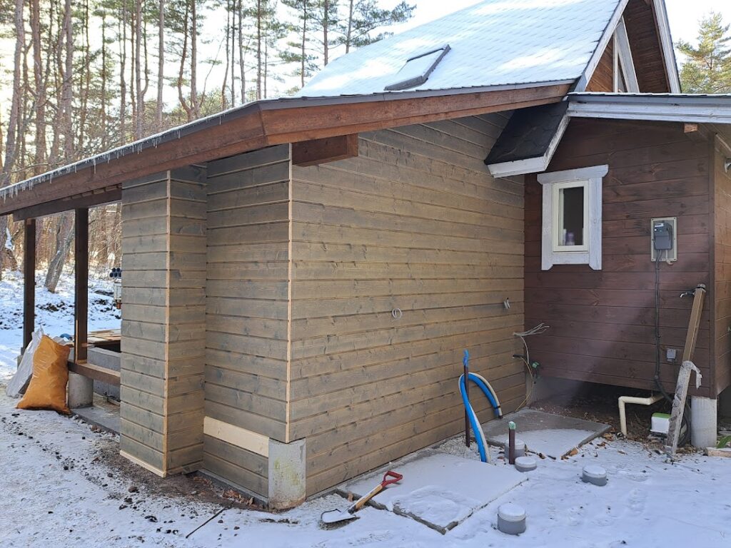 事務所から数百メートル離れた場所、元の事務所があった場所ではバーベキュー小屋とコテージの工事。母屋の下屋屋根下にサウナとミニプール作っております。 サウナは昨日室内壁板、床板施工してほぼ形になってきました。 トイレ併設のバーベキュー小屋も壁を貼り込んでおります。 コテージはサッシが17日にくるのでできるところから工事しておりますよ。