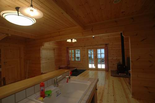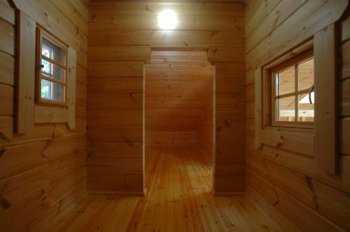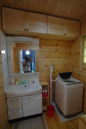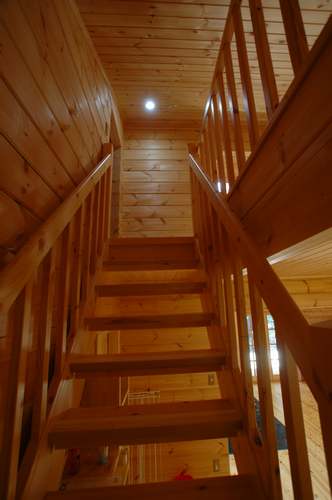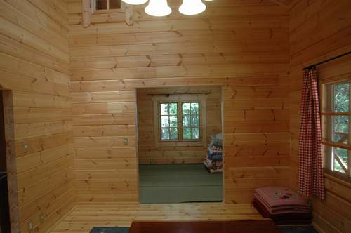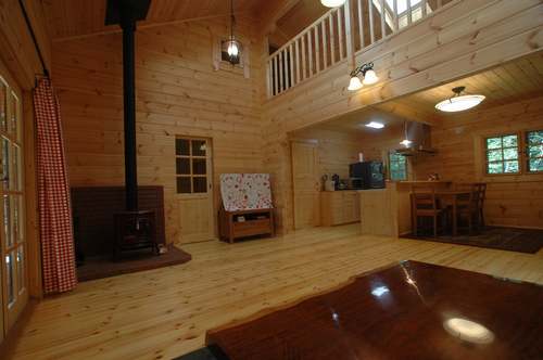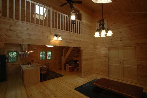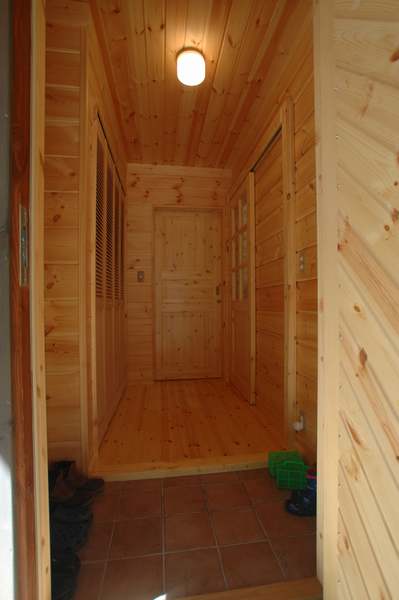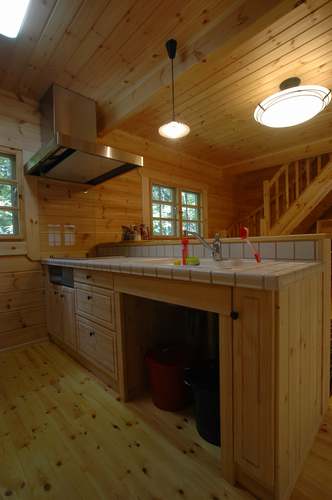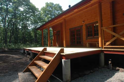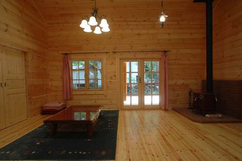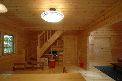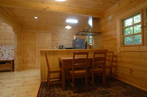 LOGHOUSE DATA Model-T邸 ●使用目的=セカンドハウス ●所在地=群馬県吾妻郡嬬恋村鎌原 ●延床面積=128.81㎡[1階=74.88㎡、2階= 53.93㎡、デッキ・ベランダ=39.28㎡] ●使用ログ材=フィンランドパイン(エストニア加工) ●着工=2011年4月 ●完成=2011年8月●外部仕上げ=[屋根材=ガルバニウム鋼板(屋根屋西山式シート) / 塗料=キシラデコール2回塗り(ピニー) / 基礎=H=1200mm布基礎 ] ●間取り=KL29アレンジモデル
