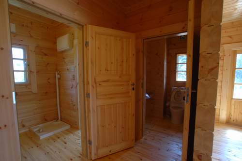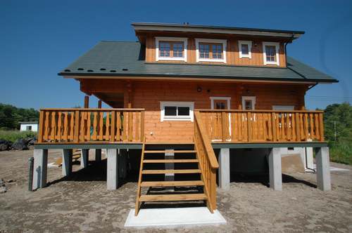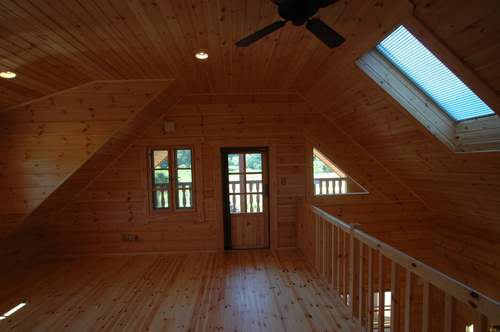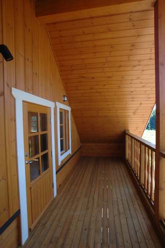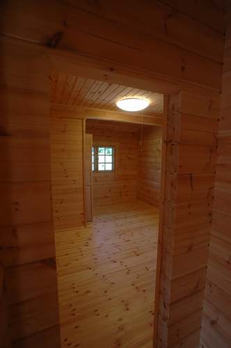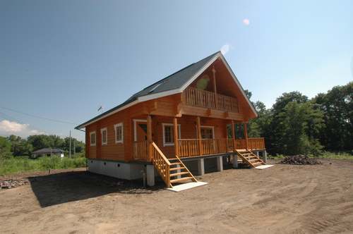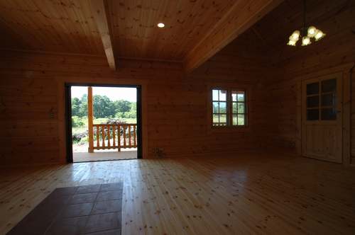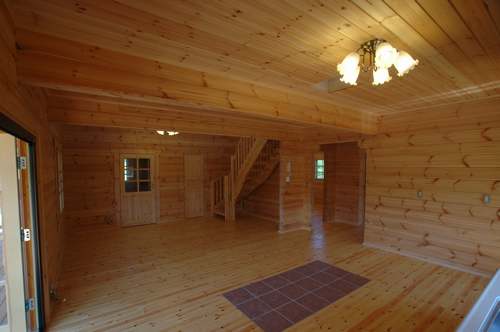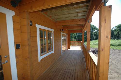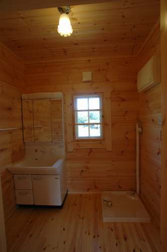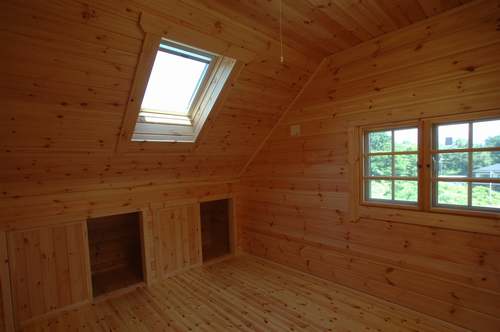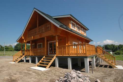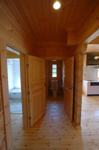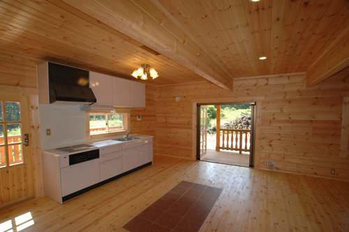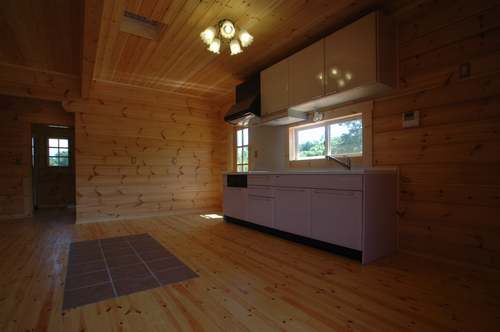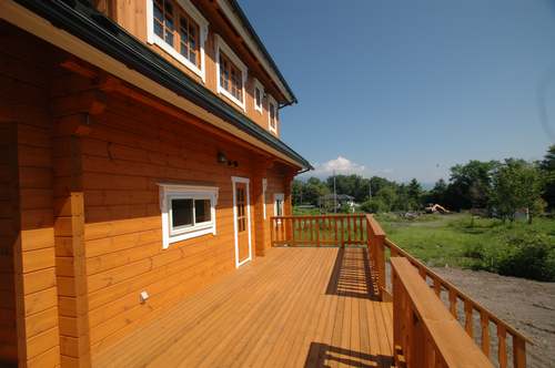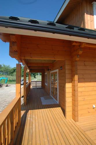 LOGHOUSE DATA Model-K邸 ●使用目的=住宅 ●所在地=群馬県吾妻郡嬬恋村鎌腹 ●延床面積=120.85㎡[1階=72.16㎡、2階= 48.69㎡、デッキ・ベランダ=53.14㎡] ●使用ログ材=フィンランドパイン(エストニア加工) ●着工=2011年2月 ●完成=2011年7月●外部仕上げ=[屋根材=ガルバニウム鋼板 / 塗料=キシラデコール2回塗り / 基礎=H=1800mmベタ基礎 ]