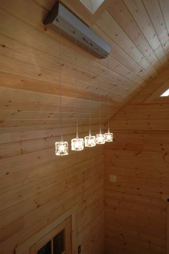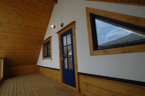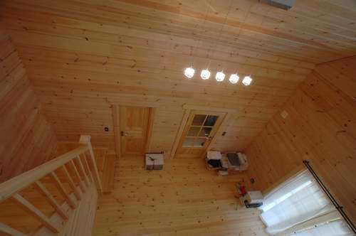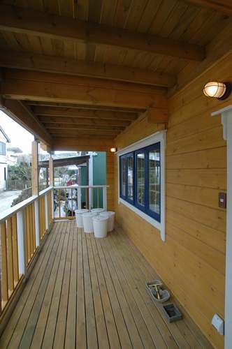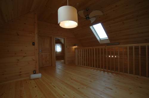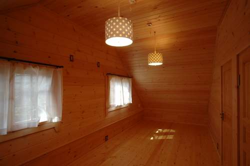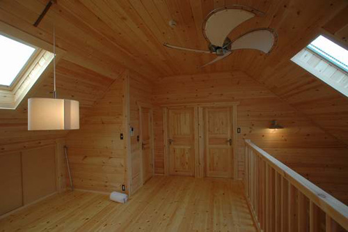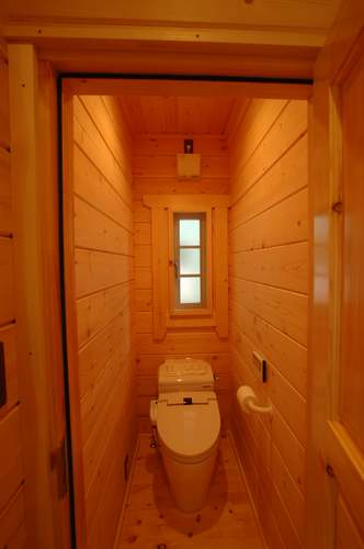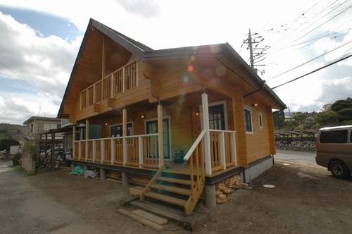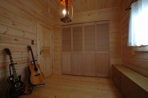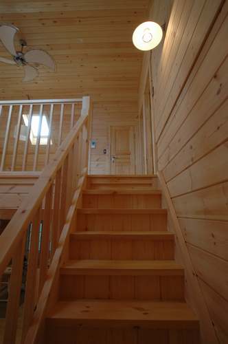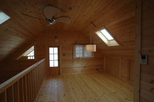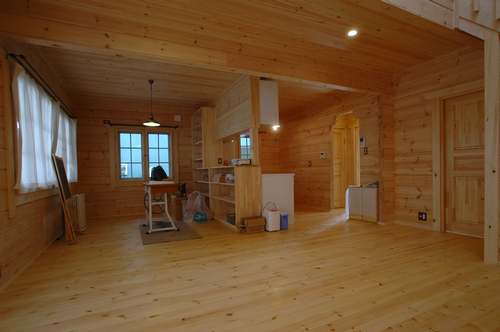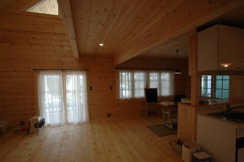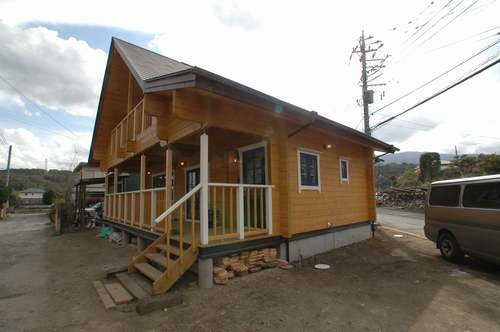 LOGHOUSE DATA Model-K邸様 ●使用目的=住宅 ●所在地=神奈川県南足柄市 ●延床面積=112.75㎡[1階=65.75㎡、2階= 47.00㎡、デッキ・ベランダ=33.2㎡] ●使用ログ材=シベリアパイン105×175mmラミネートログハウス ●着工=2010年11月 ●完成2011年4月 ●外部仕上げ=[屋根材=ガルバニウム鋼板(遮熱ルーフィング) / 塗料=キシラデコール2回塗り(セルフペイント) / 基礎=立上げ600mm布基礎 (防湿コンクリート)