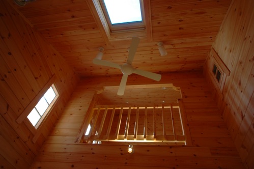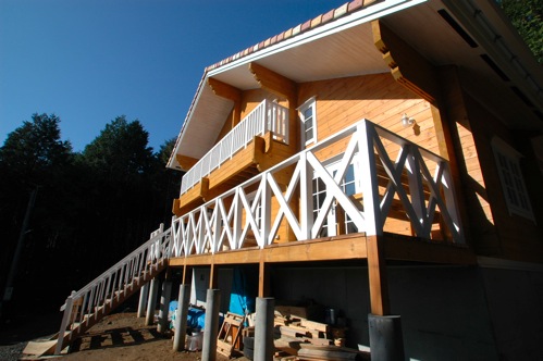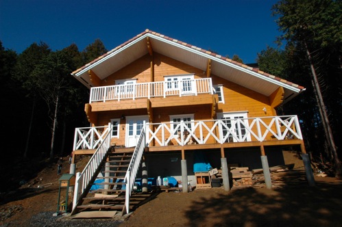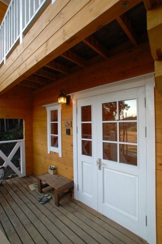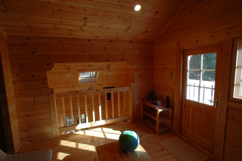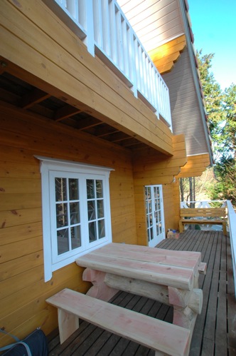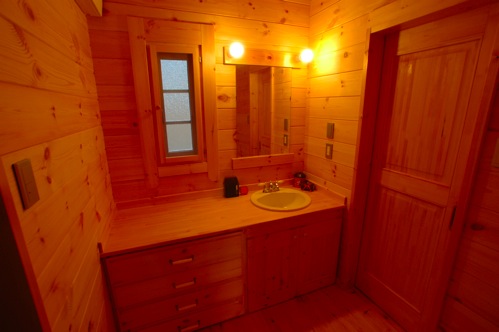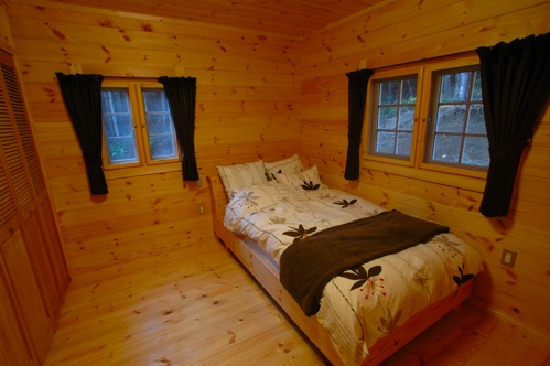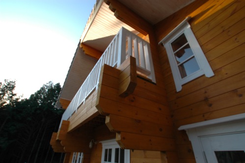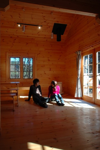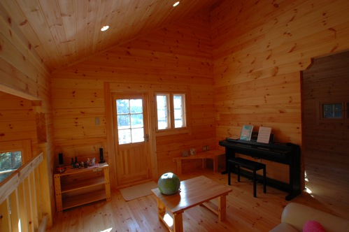 Modei-T邸 ●使用目的=住宅 ●所在地=茨城県常陸大宮市 ●延床面積=135.58㎡[1階=75.6㎡、2階=59.98㎡、デッキ・ベランダ=30.8㎡] ●使用ログ材=シベリアパイン105×175㎜ラミネートログハウス ●着工=2008年7月 ●完成=2008年12月●外部仕上げ=[屋根材=洋瓦 / 塗料=キシラデコール2回塗り /妻壁、ドーマー板張り/ 基礎=H=1800㎜ベタ基礎 ] ●間取り=KB42アレンジモデル