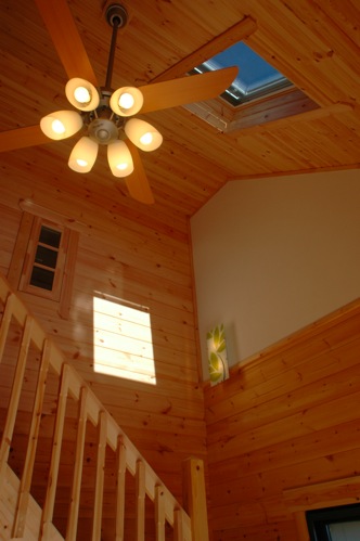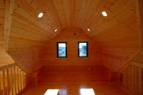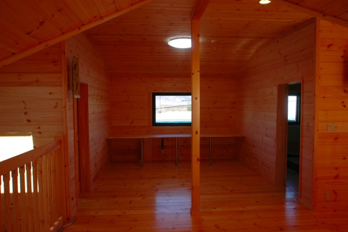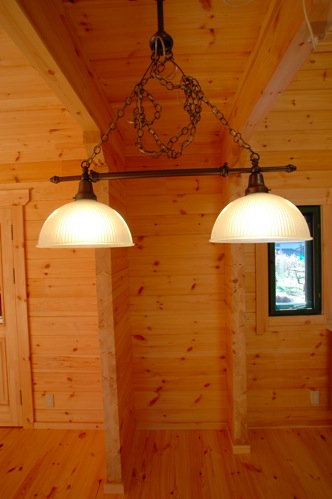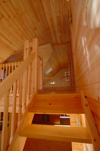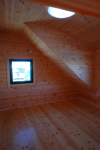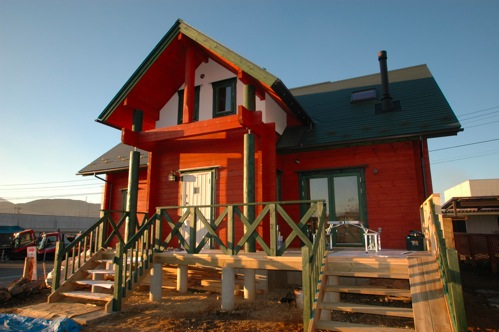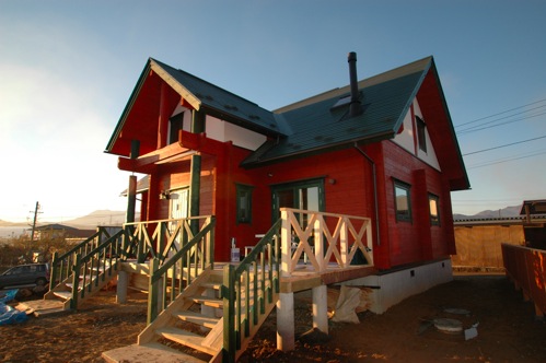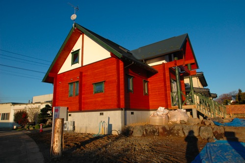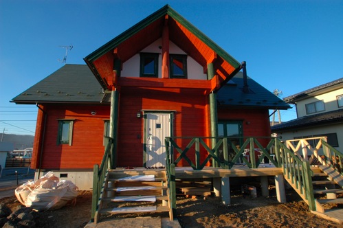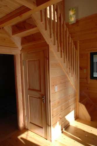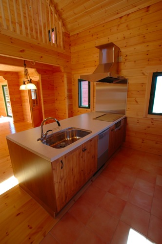 Modei-K邸 ●使用目的=住宅 ●所在地=長野県中野市 ●延床面積=152.5㎡[1階=83.16㎡、2階=69.34㎡、デッキ・ベランダ=11.88㎡] ●使用ログ材=シベリアパイン105×175㎜ラミネートログハウス ●着工=2008年9月 ●完成=2008年12月●外部仕上げ=[屋根材=ガルバニウム鋼板 / 塗料=キシラデコール2回塗り /妻壁、ドーマー=テラコート塗り/ 基礎=H=1800㎜ベタ基礎 ] ●間取り=KL40アレンジモデル