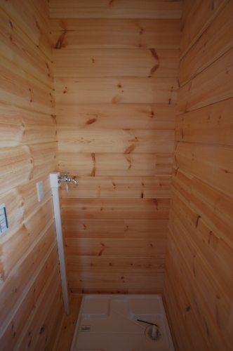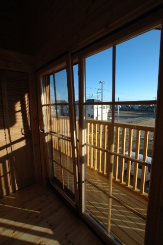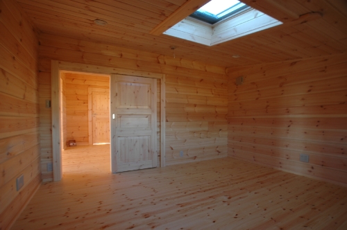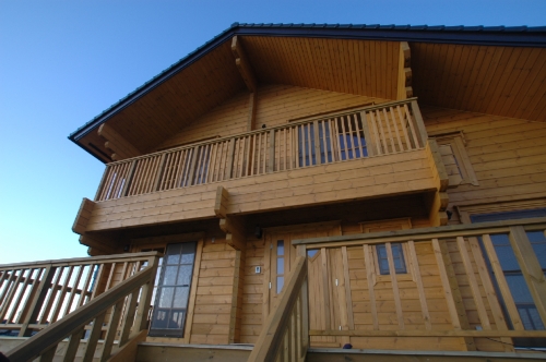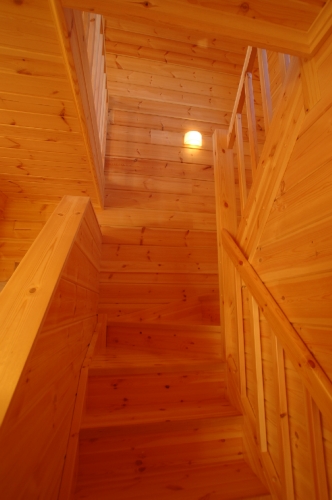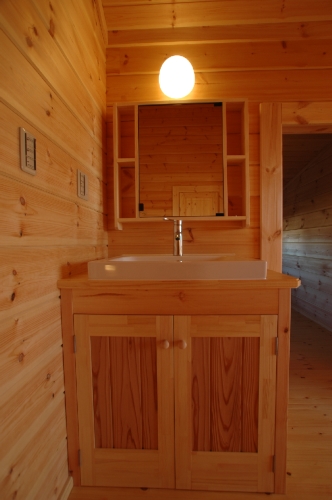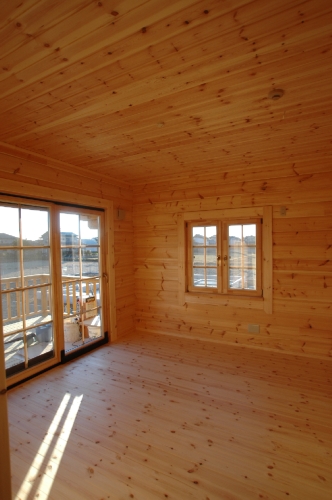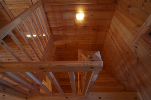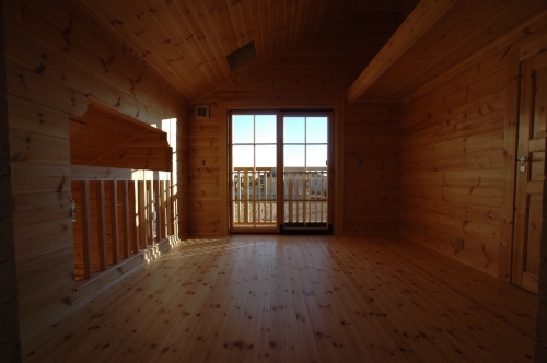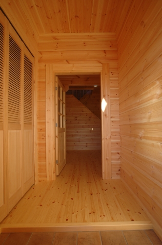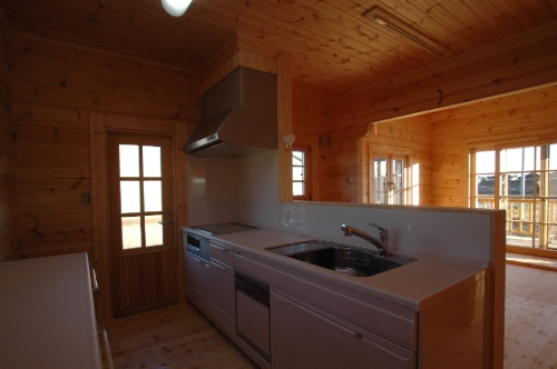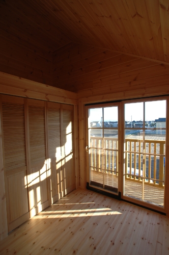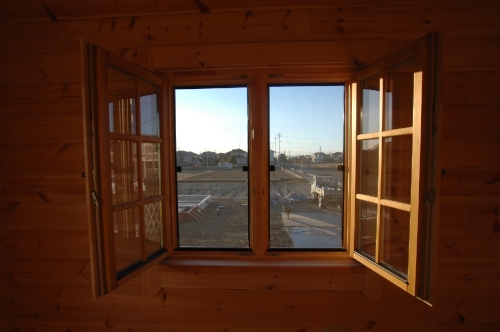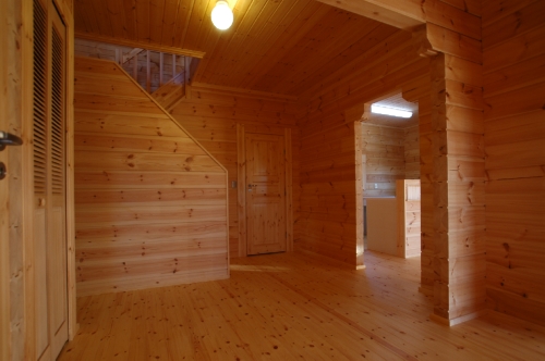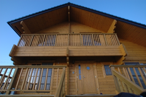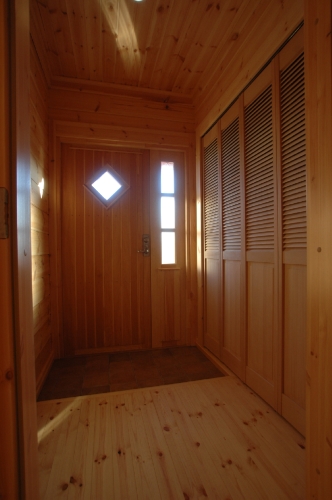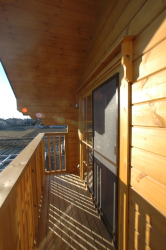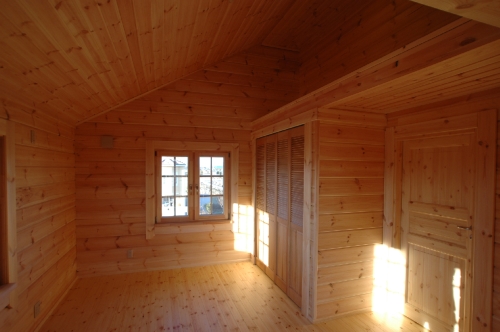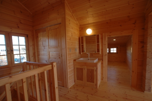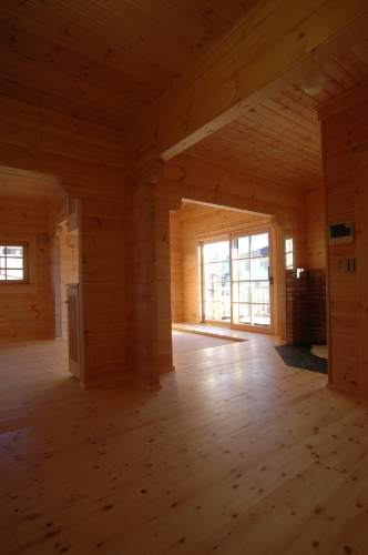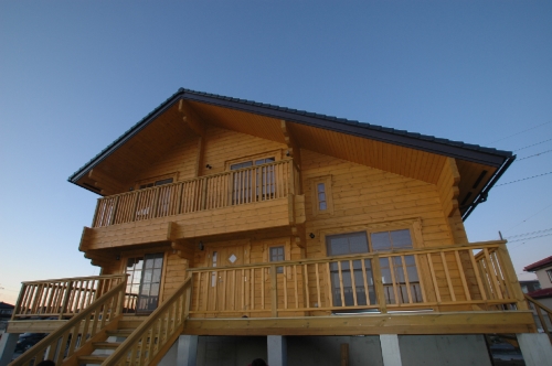 Modei-F邸 ●使用目的=住宅 ●所在地=群馬県邑楽郡 ●延床面積=139.4㎡[1階=----㎡、2階=----㎡、デッキ・ベランダ=36.2㎡] ●使用ログ材=北欧レッドパイン113×180㎜ラミネートログハウス ●着工=2011年8月 ●完成=2011年10月●外部仕上げ=[屋根材=野安瓦 セラマウント / 塗料=キシラデコール2回塗り / 基礎=H=1800㎜ベタ基礎 ] ●間取り=KB42アレンジモデル