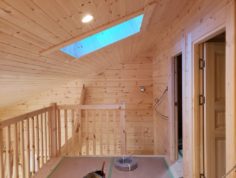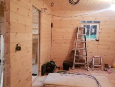 建て方4日目でログ組み完了して垂木がけ、一部野地板張りが完了しました。