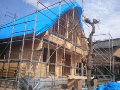 無事上棟となりました。ログハウス隣では農機具小屋も同時進行で進み本日骨組みとなりました!