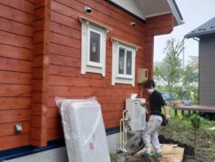 ログ壁はスカンジナビアンレッド!いい感じとなりそうですよ!