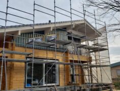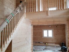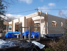 フィンランドラミネートログハウス134ミリ厚のログハウス建て方工事進めています。