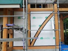 塗装工事に入りましてティンバーフレーム部分に色がつきましたね。