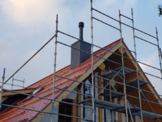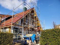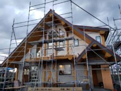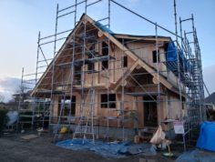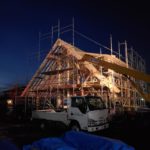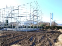 群馬県沼田市のT様邸基礎工事、足場が架かり数日後、檜のポスト&ビームの建物の躯体工事が始まります。