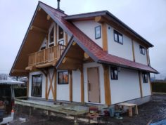 赤レンガ色に丸太はキシラデコールのスプルース。