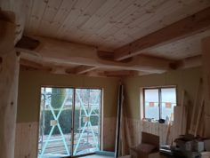 2階はスキャンDホーム風のホワイト塗装したログパネル施工しています。