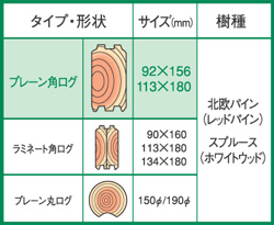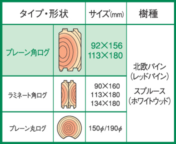 エストニアログハウス標準仕様ログ材シャープな平面加工の角ログ2タイプと美しい曲面加工の丸ログ、いずれも高精度なマシンカットログをご用意。樹種は強度と耐久性に優れた「北欧パイン」と、白く美しい木肌が持ち味の「スプルース」からお選び頂けます