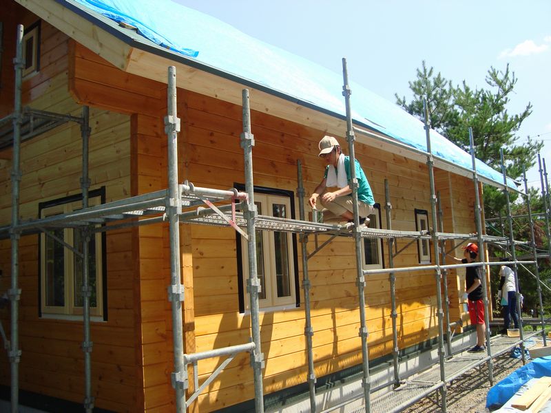 家全体に充分な軒のある屋根をかけ、家の中が明るいように吹き抜けに天窓を3つ付け、造作キッチンのアイデアを頂き、外壁の塗装は自分達でやりました。