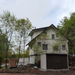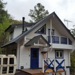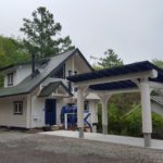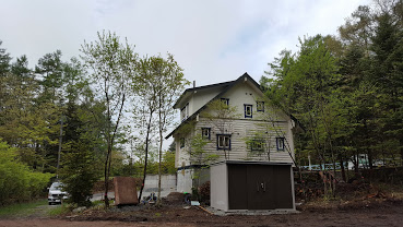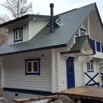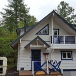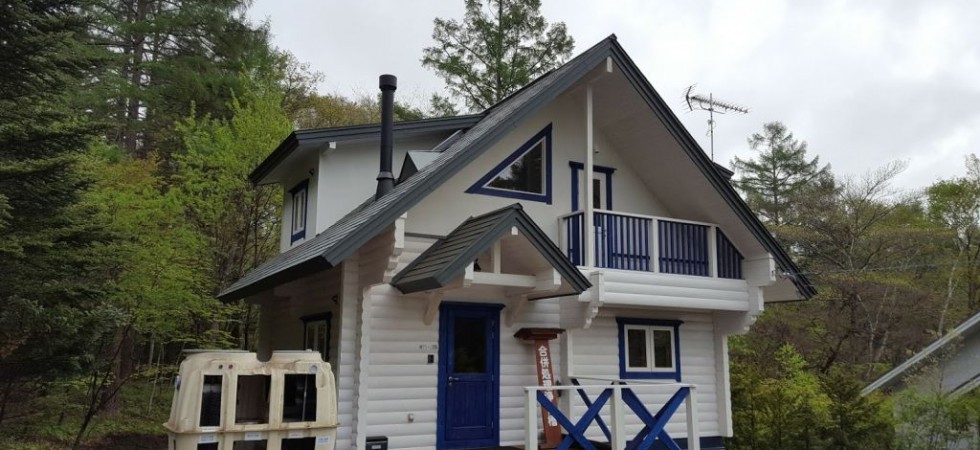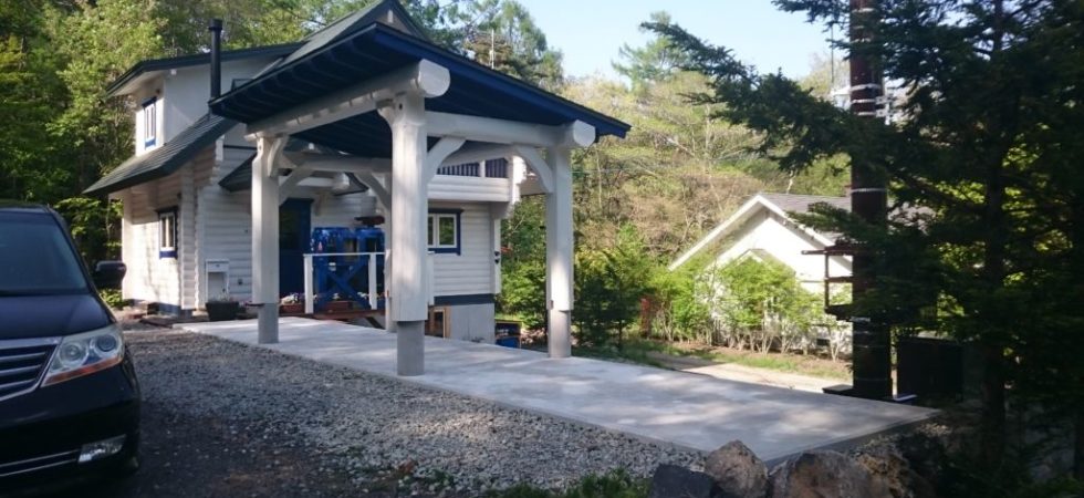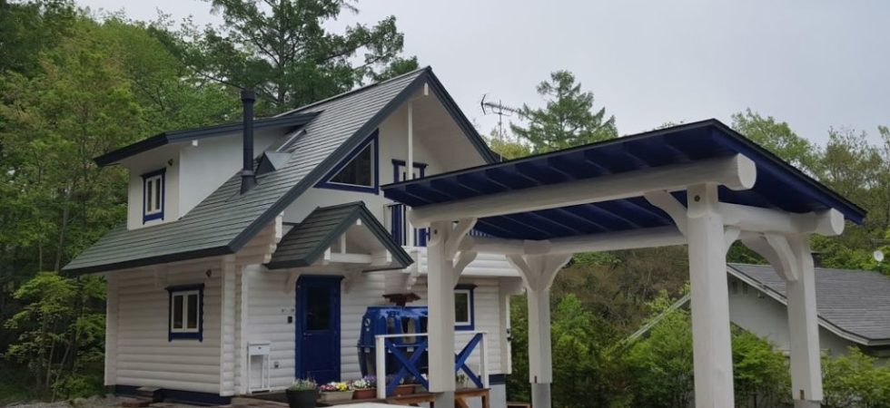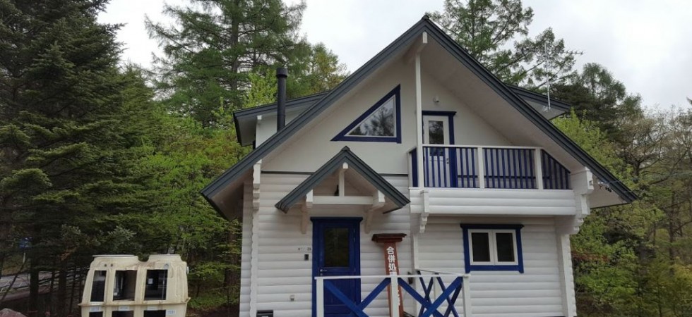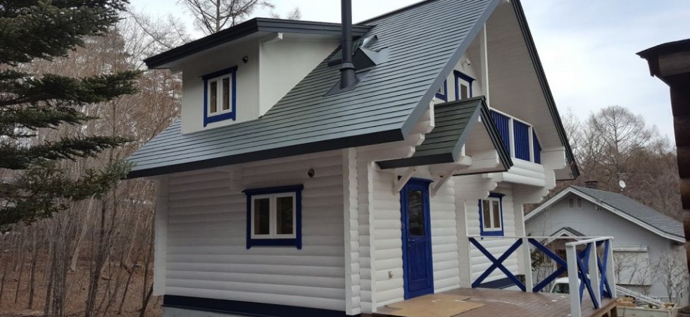 基礎は2.3mの高基礎仕様で上の道路から事務所に入れる配置になっていますよ。 カラーリングもいいですね。 カラーリング担当はクリーン設備さん若手のホープの矢島君、白い壁に水を扱う商売なので水イメージのブルーをとりいれましたよ。 格好よく仕上がりました。 ログキットは中国D型ラミネート。事務所ですが、住宅といってもいい感じのログハウスです!